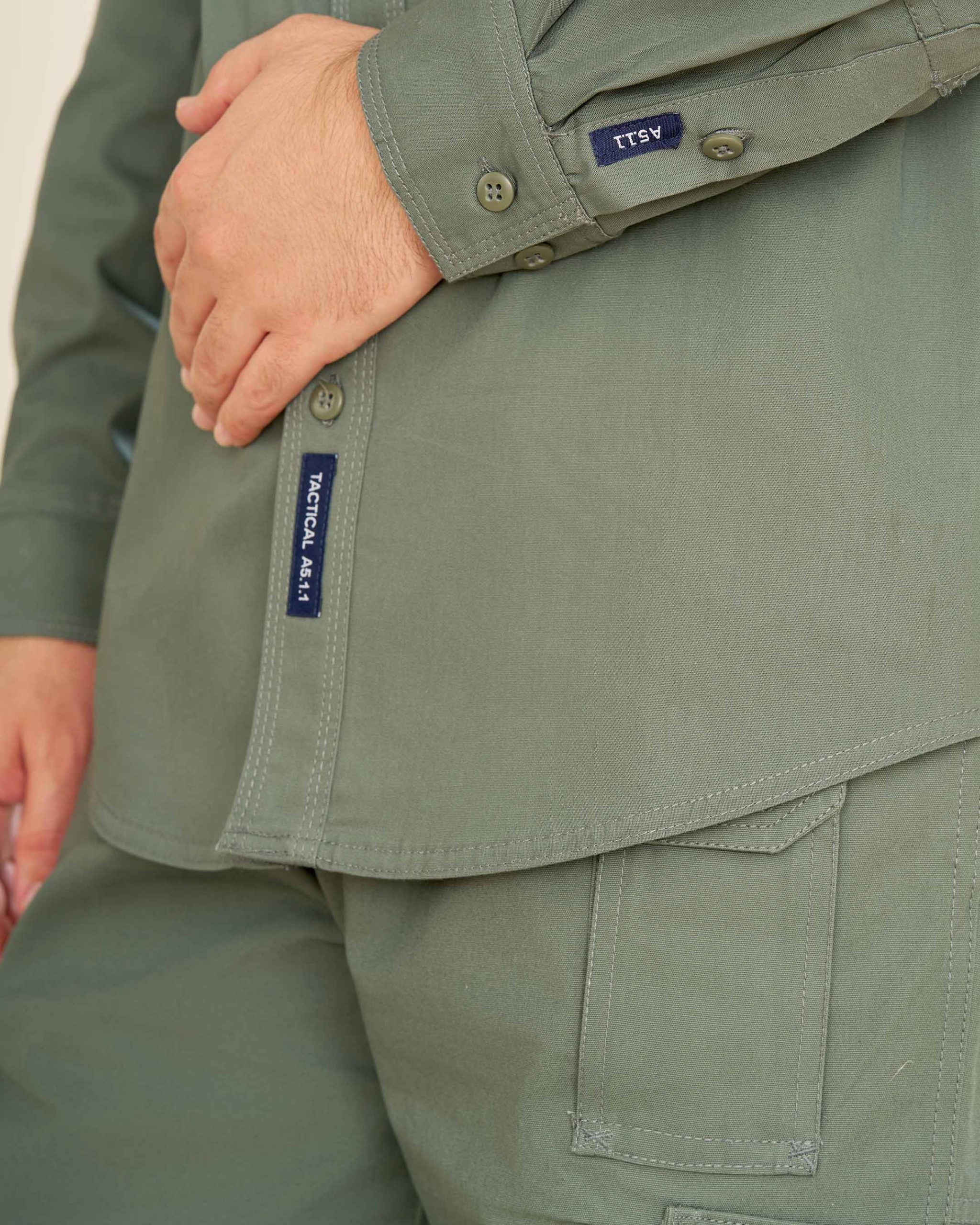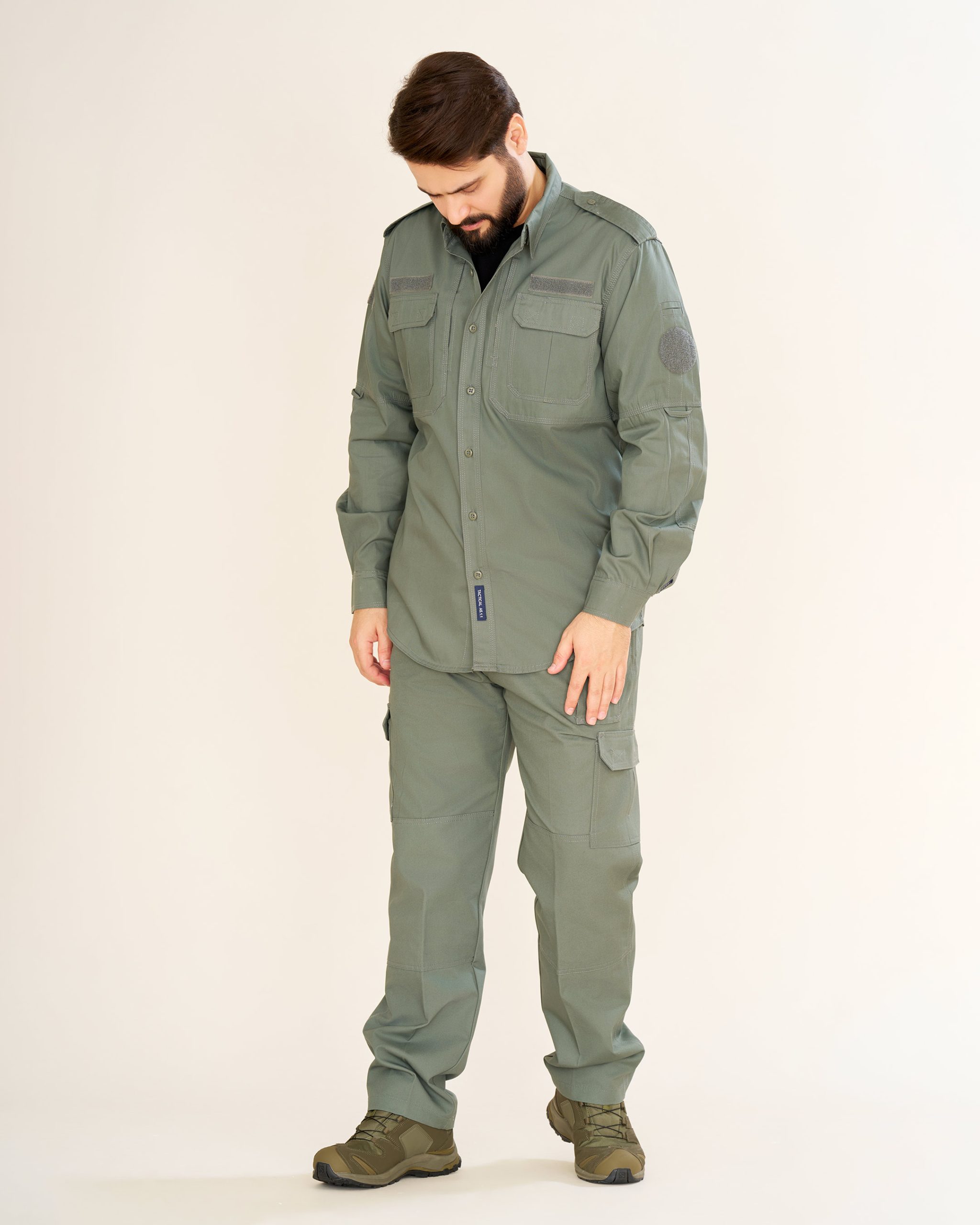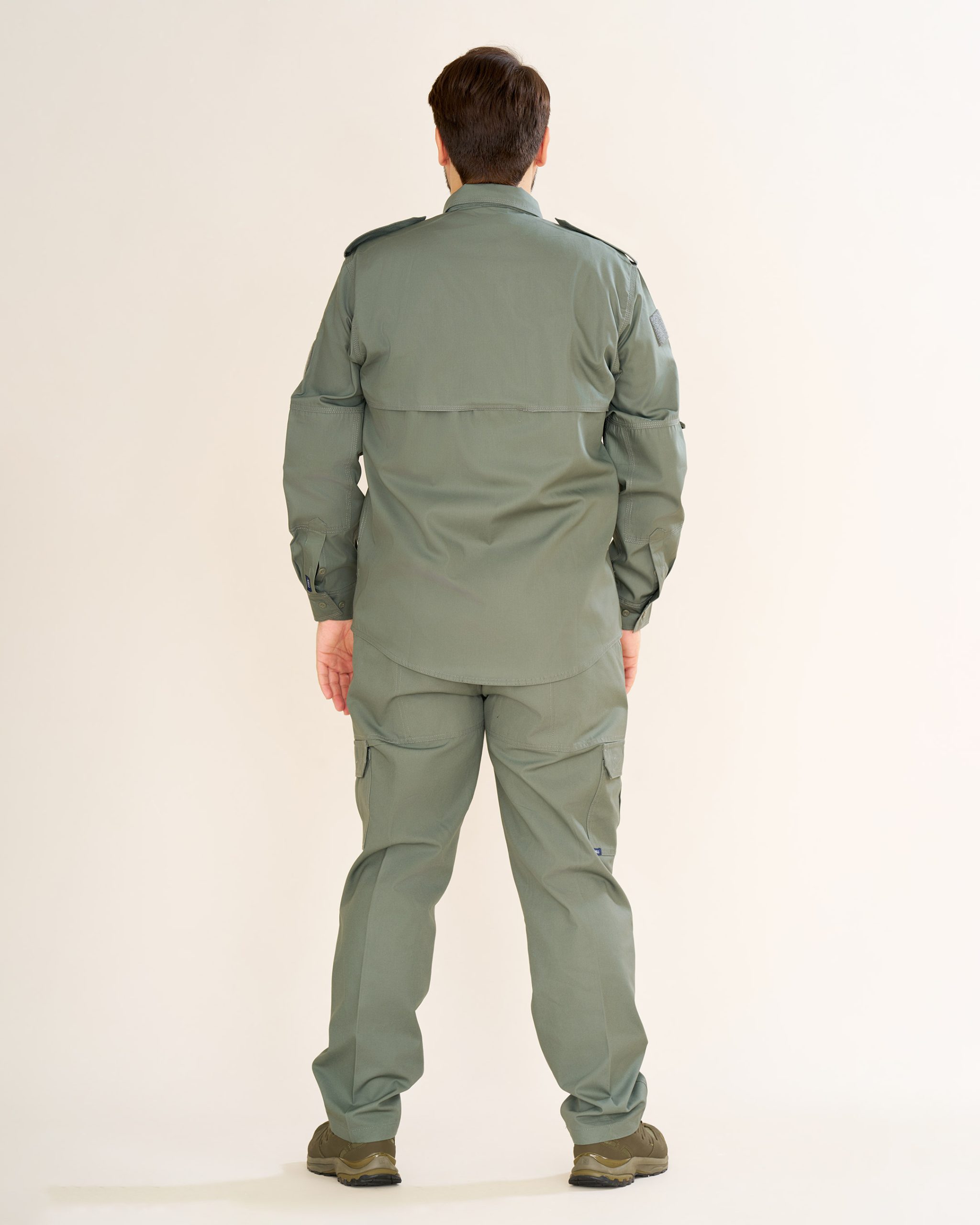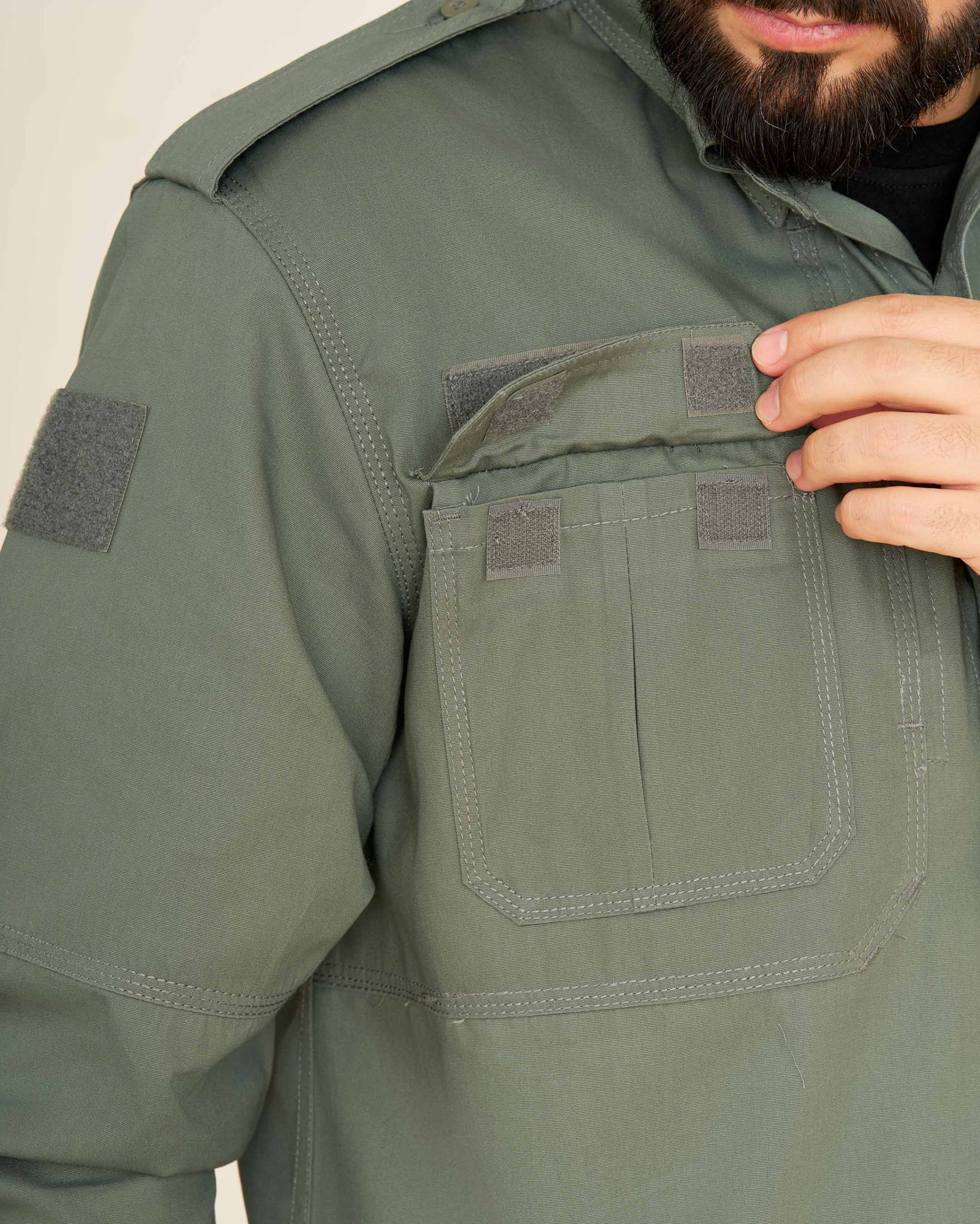 پیراهن: طراحیشده با دو جیب جلو و سرشانه، بهعلاوه دو جیب مخفی چسبی در طرفین سینه. بالای جیبهای سینه جایگاه مخصوص برچسب اسم یا ارگان قرار دارد که آن را برای استفاده سازمانی نیز مناسب میسازد.
