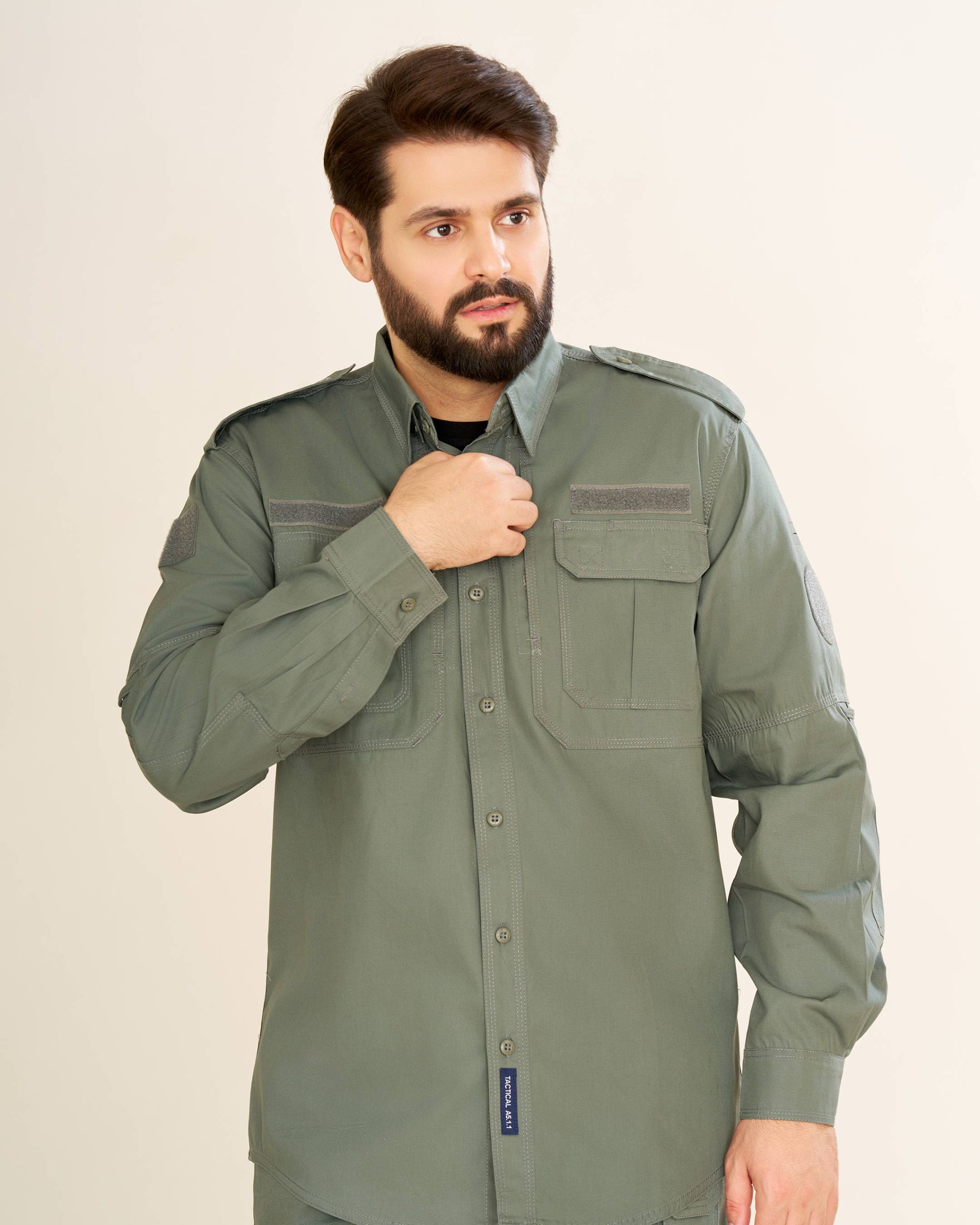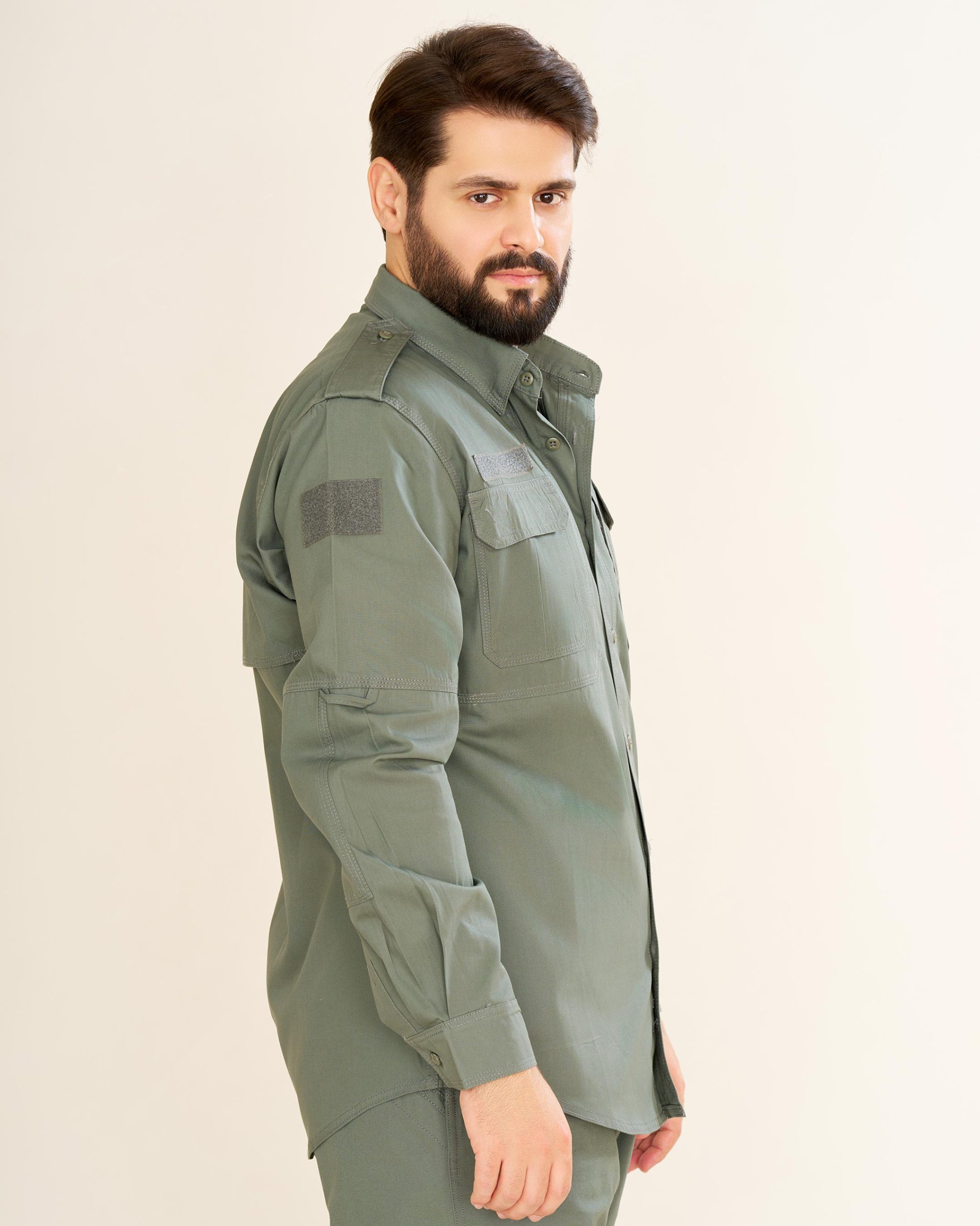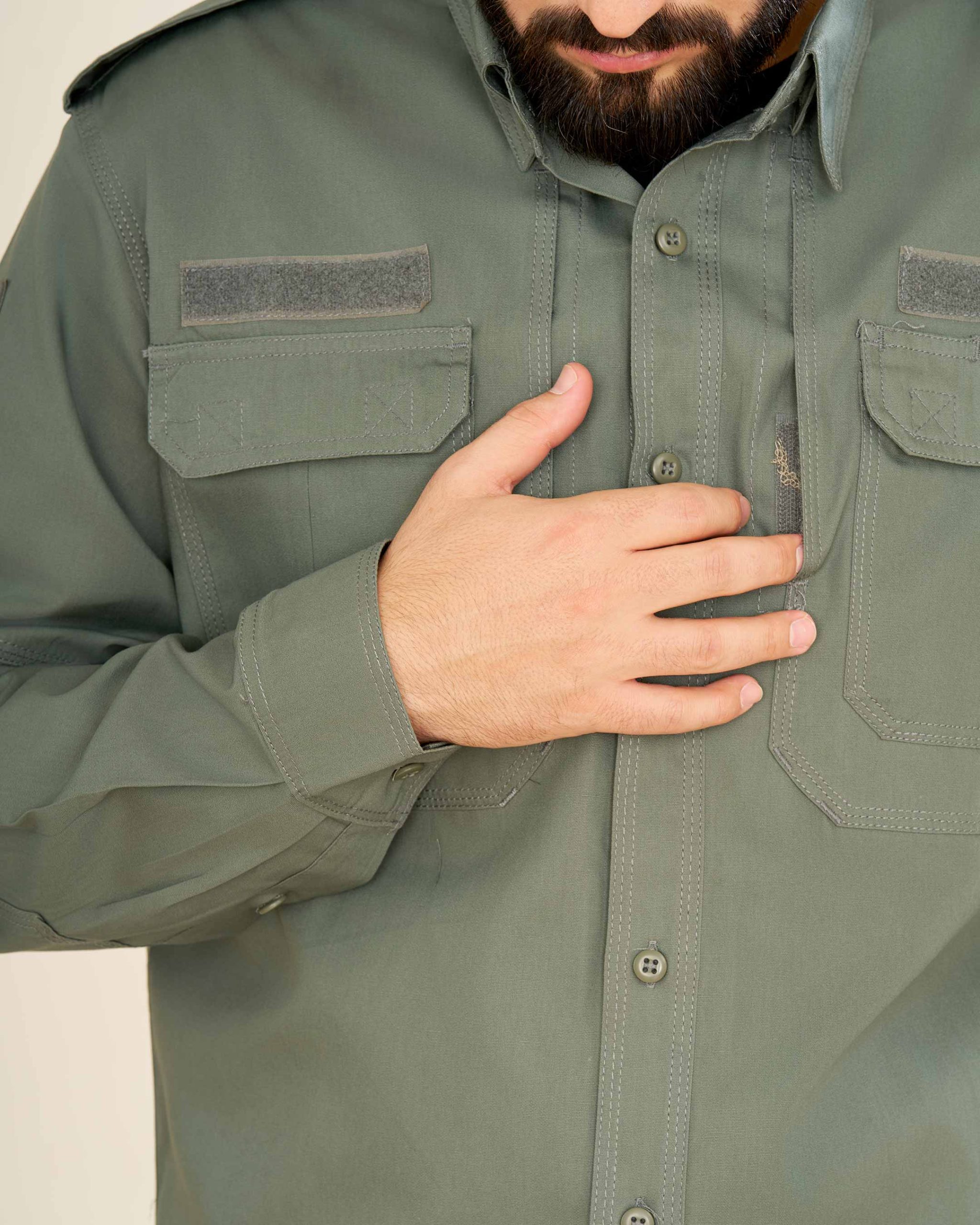 پیراهن: طراحیشده با دو جیب جلو و سرشانه، بهعلاوه دو جیب مخفی چسبی در طرفین سینه. بالای جیبهای سینه جایگاه مخصوص برچسب اسم یا ارگان قرار دارد که آن را برای استفاده سازمانی نیز مناسب میسازد.
