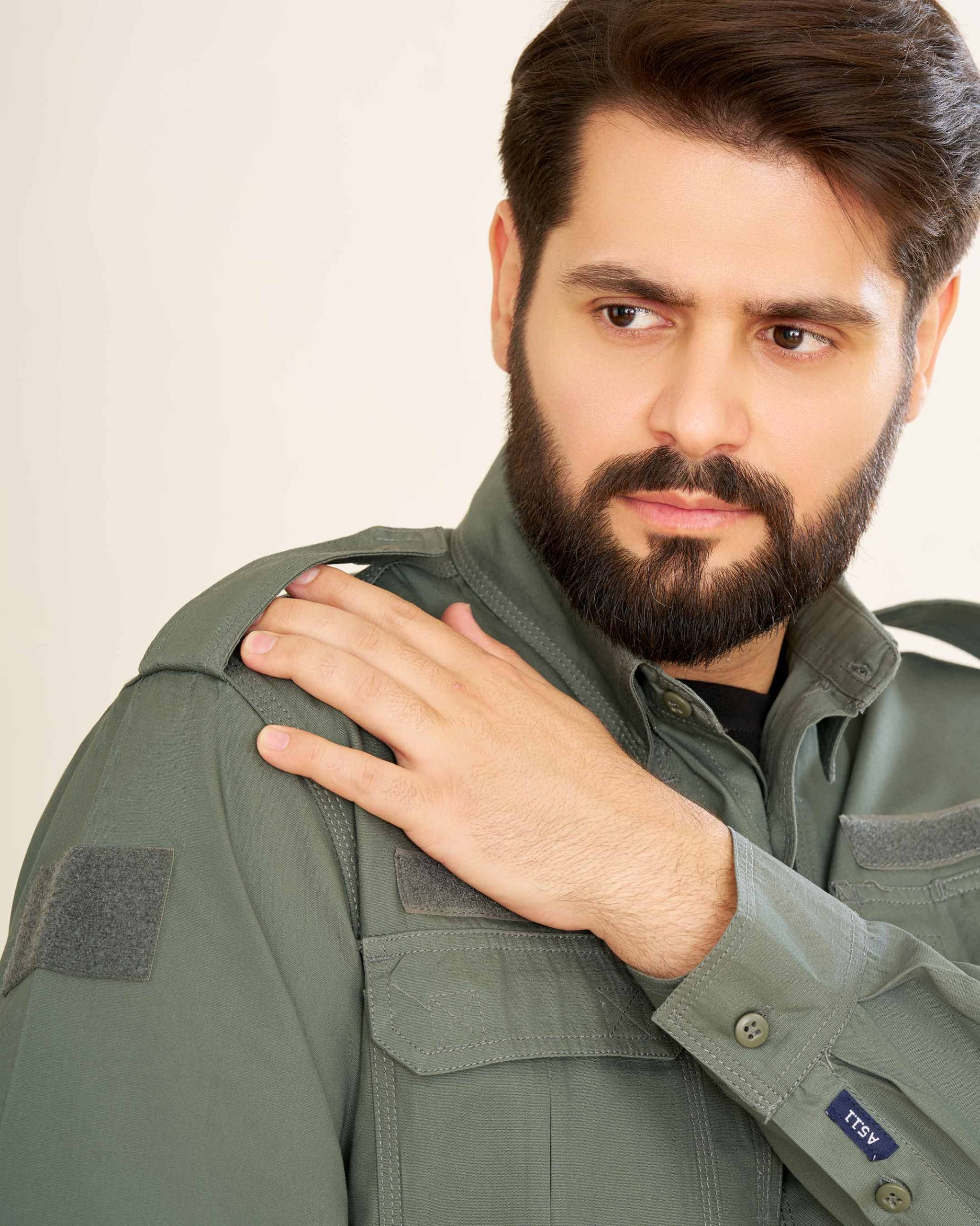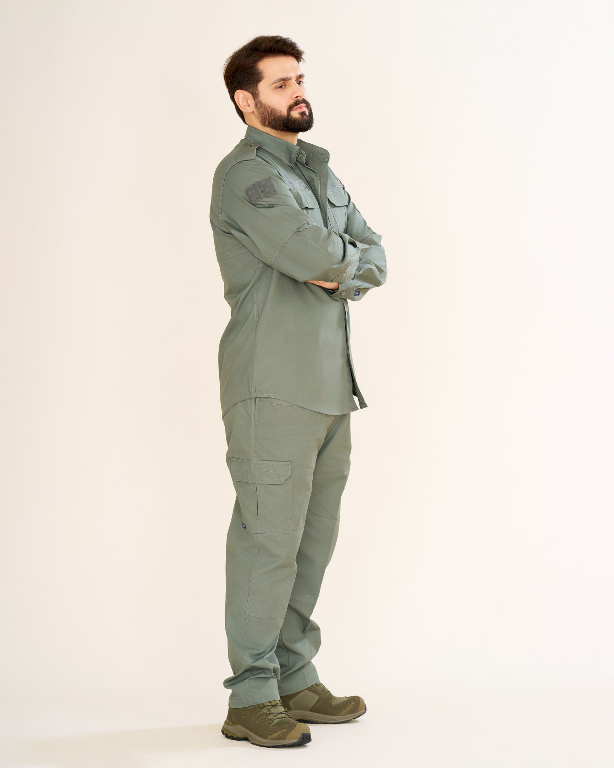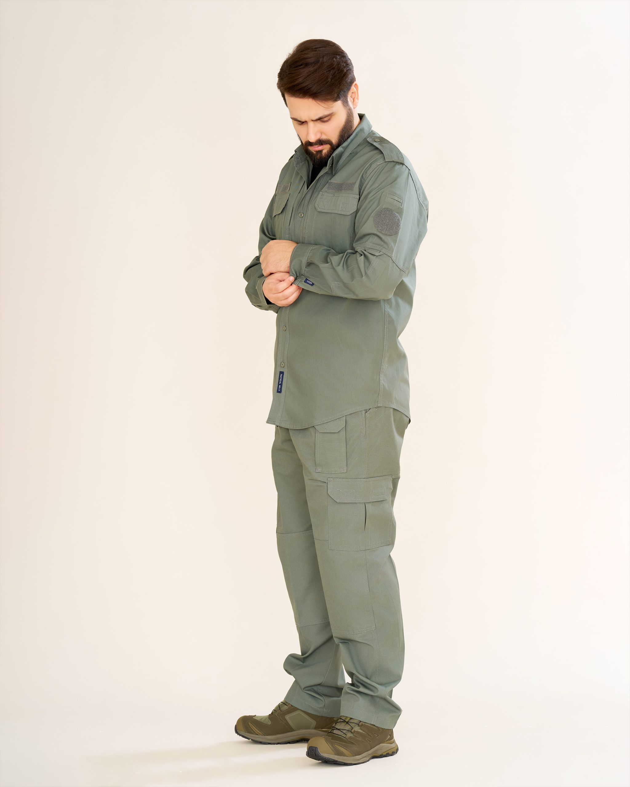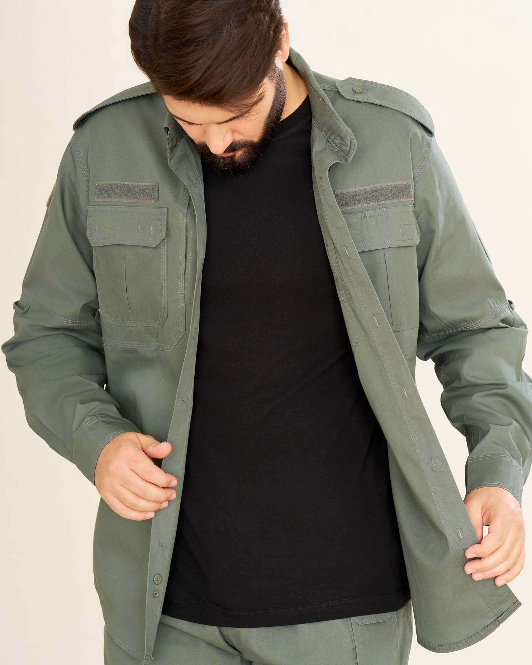 پیراهن: طراحیشده با دو جیب جلو و سرشانه، بهعلاوه دو جیب مخفی چسبی در طرفین سینه. بالای جیبهای سینه جایگاه مخصوص برچسب اسم یا ارگان قرار دارد که آن را برای استفاده سازمانی نیز مناسب میسازد.