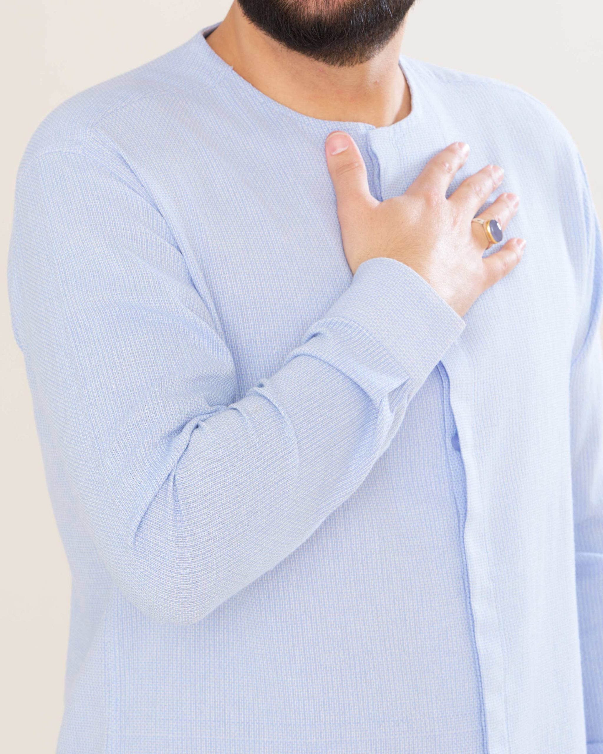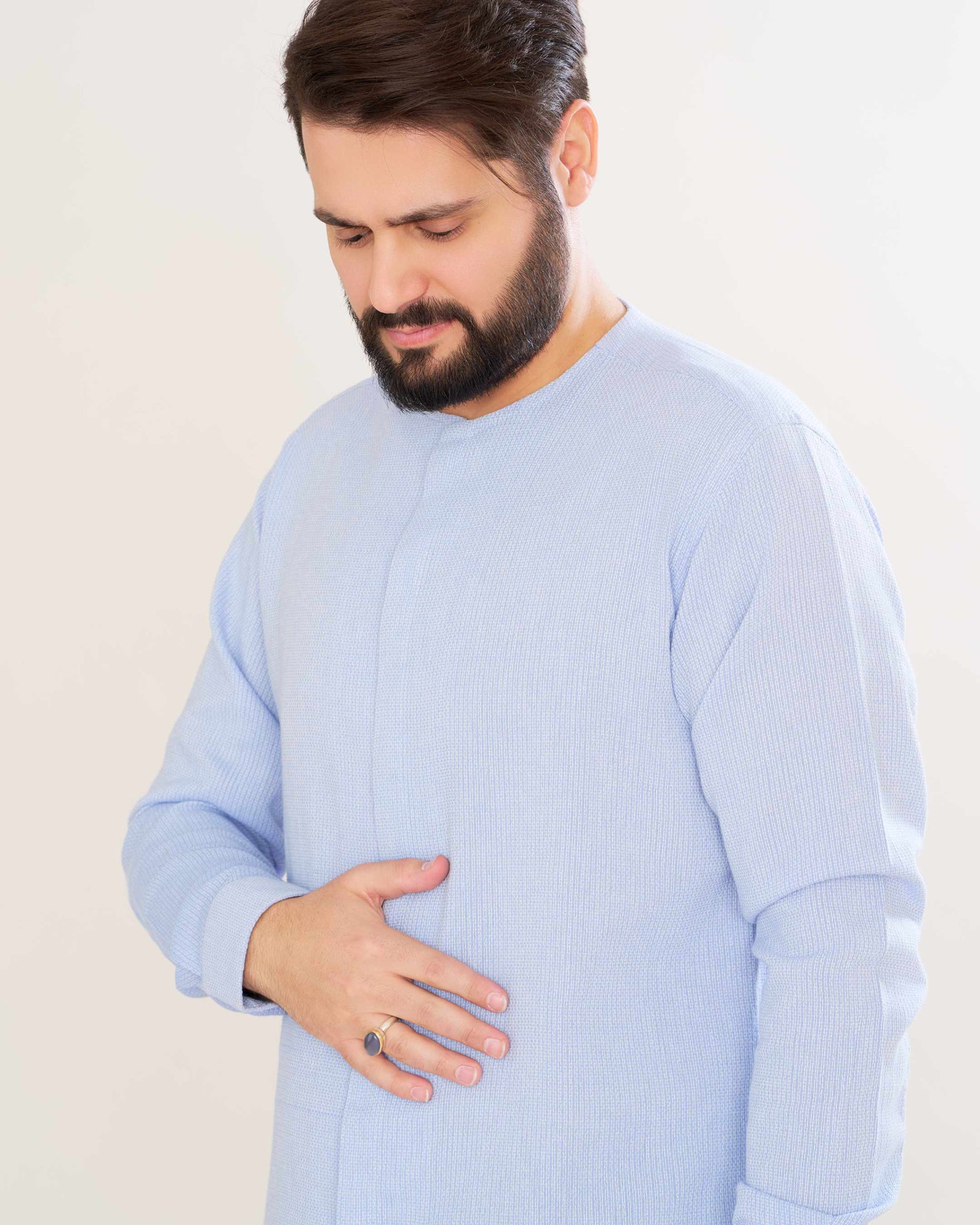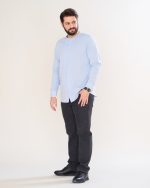 مدل ریّان: بدون یقه و جلو بسته، با آستینهای مچدار دکمهدار؛ لباسی برای آنان که آرامش و سادگی را یکجا میخواهند.