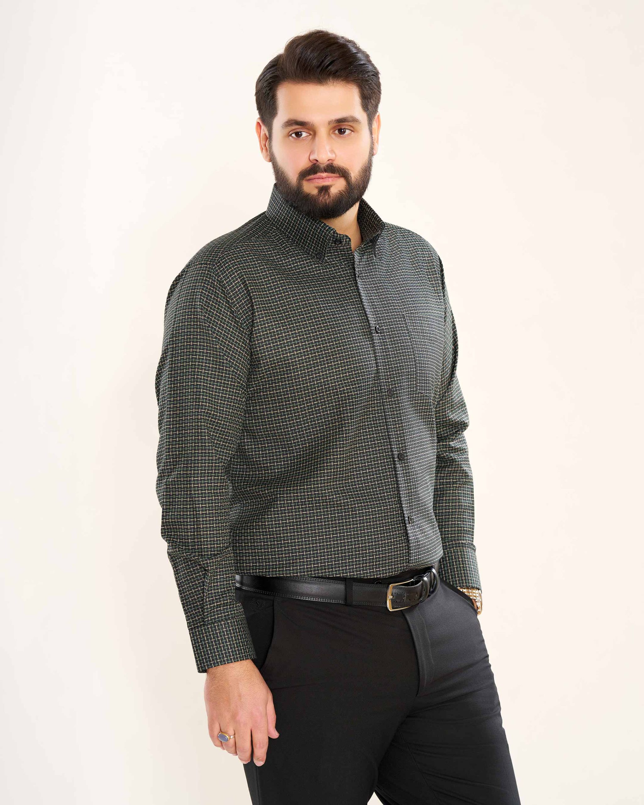 پیراهن تترون یقه انگلیسی کلاسیک زمینه تیره با خطوط سبز و کرم کد PC13039