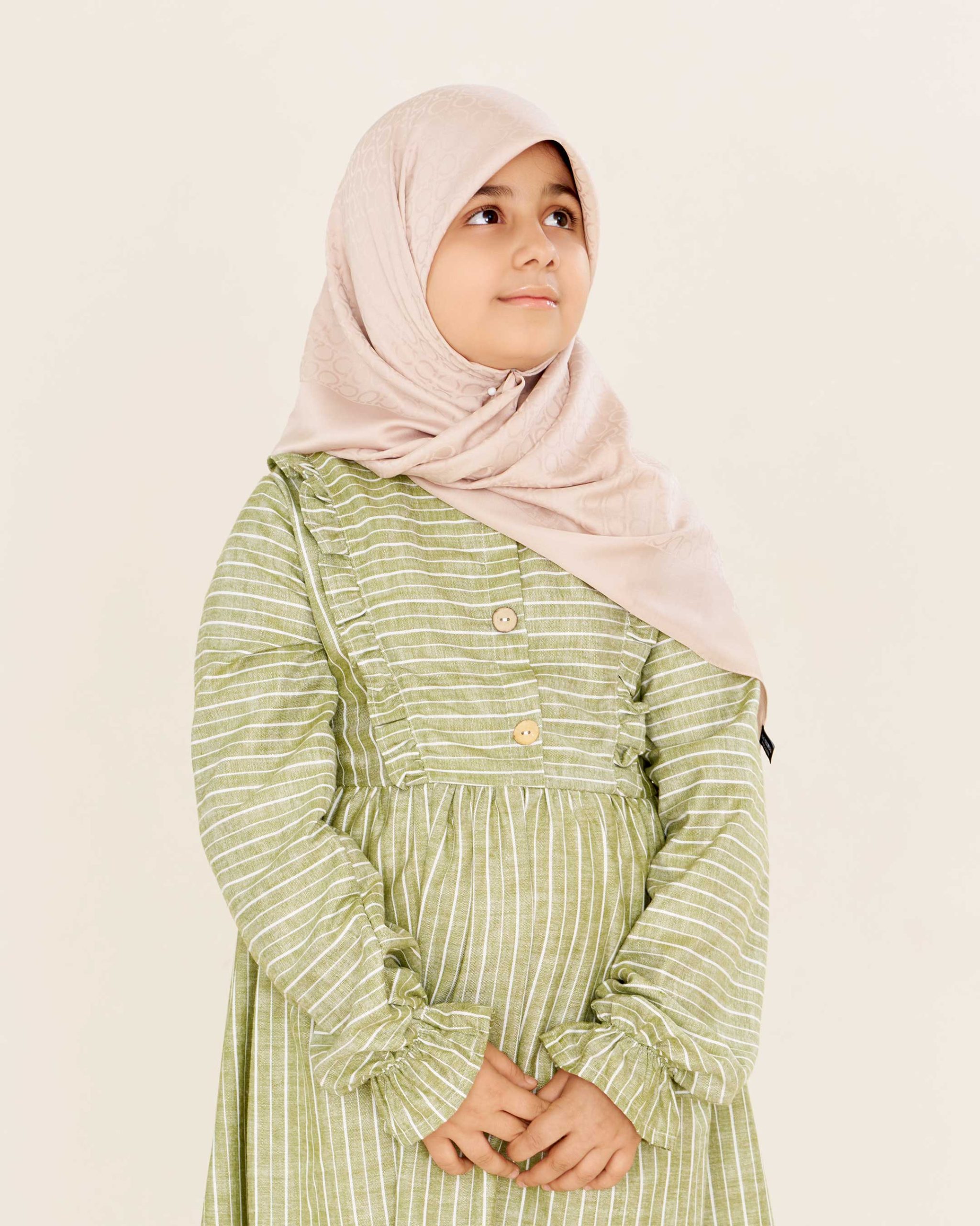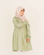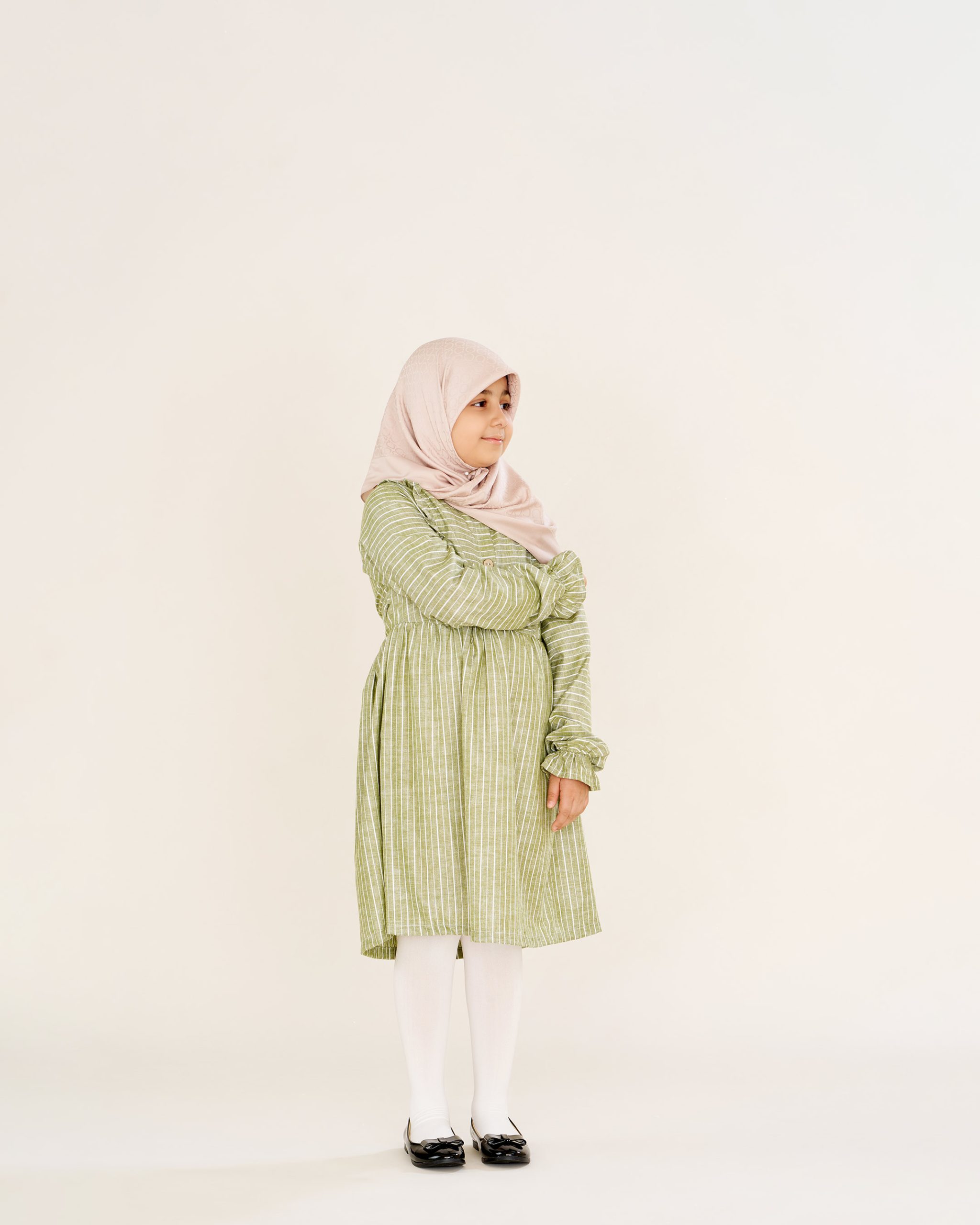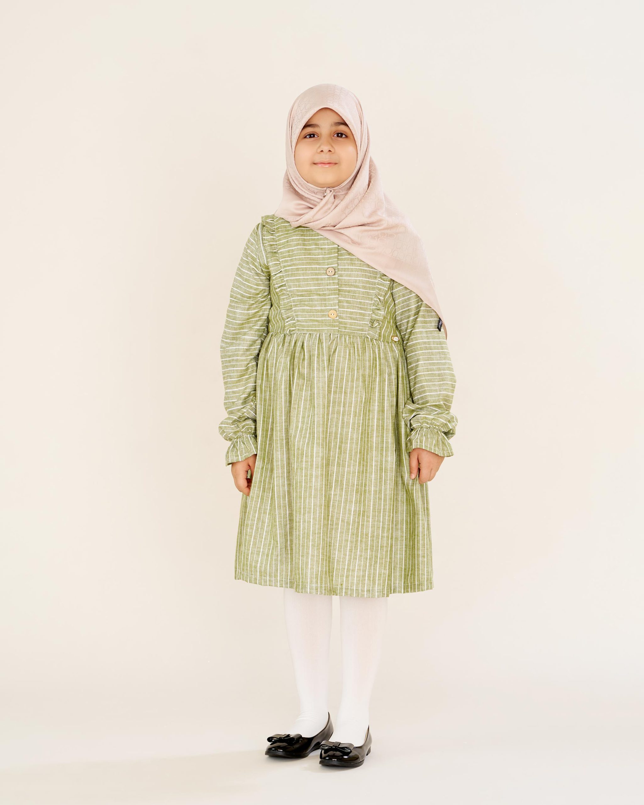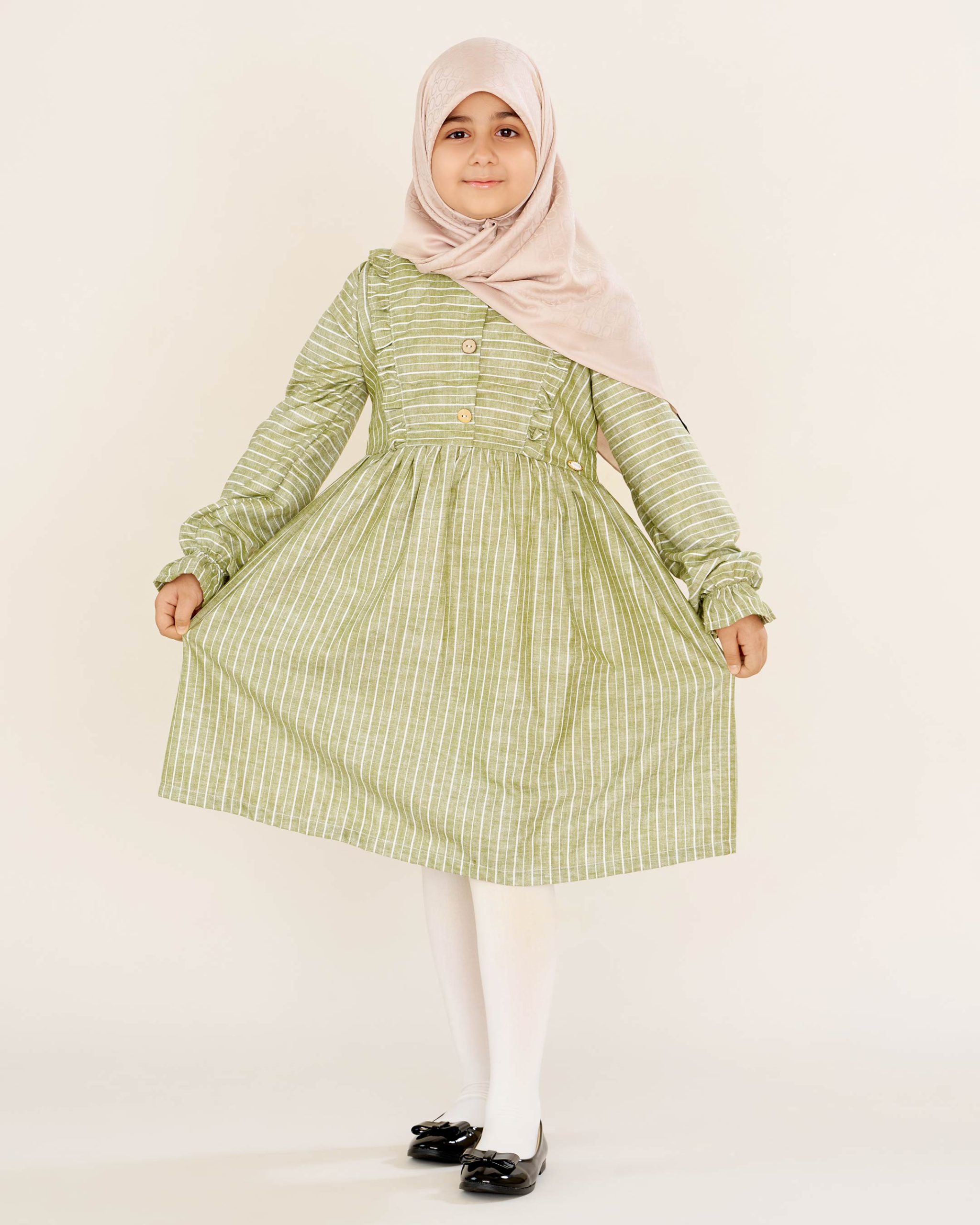 پیراهن دخترانه آستین بلند بدون یقه سه تمام دکمه زمینه سبز کد PB12097