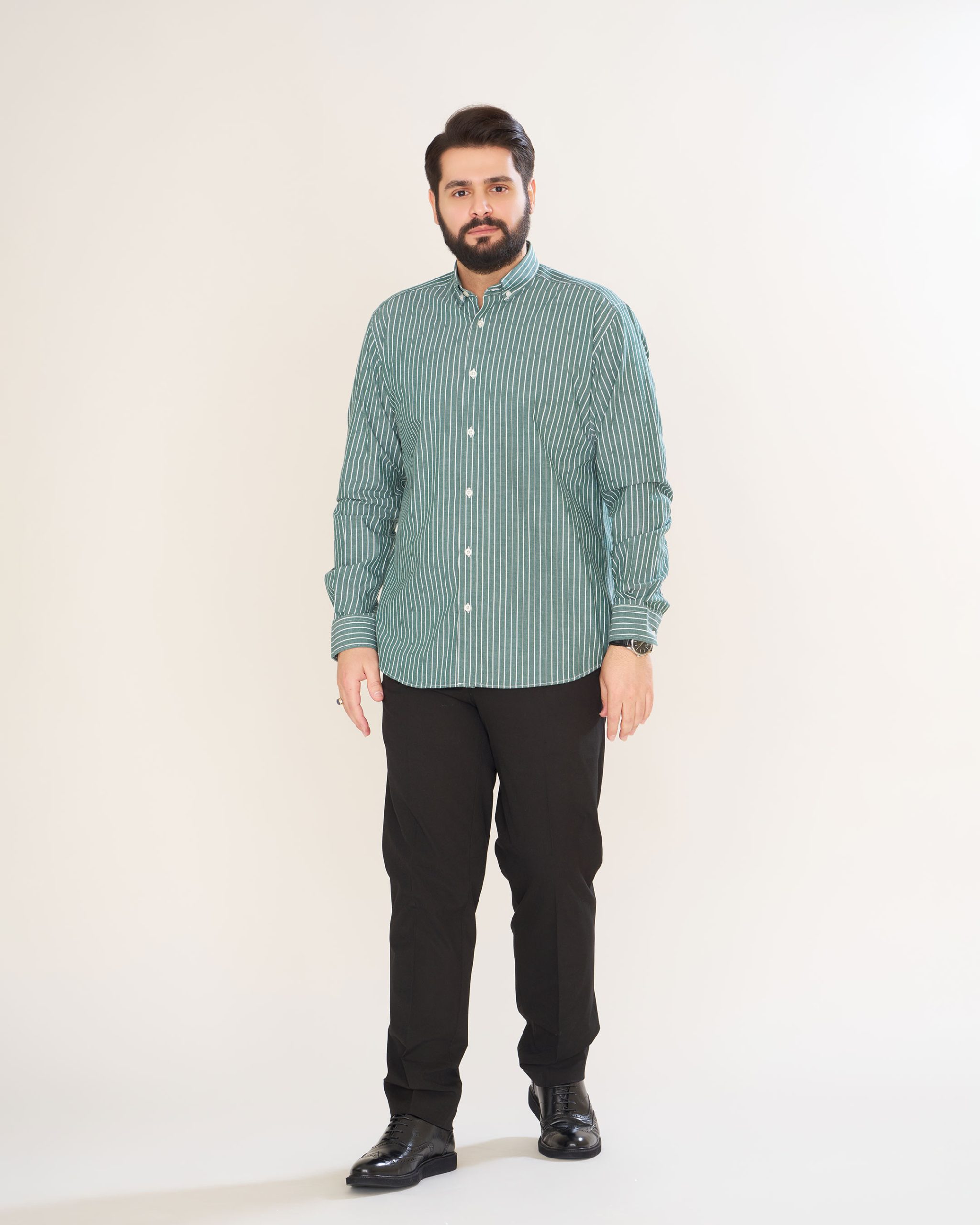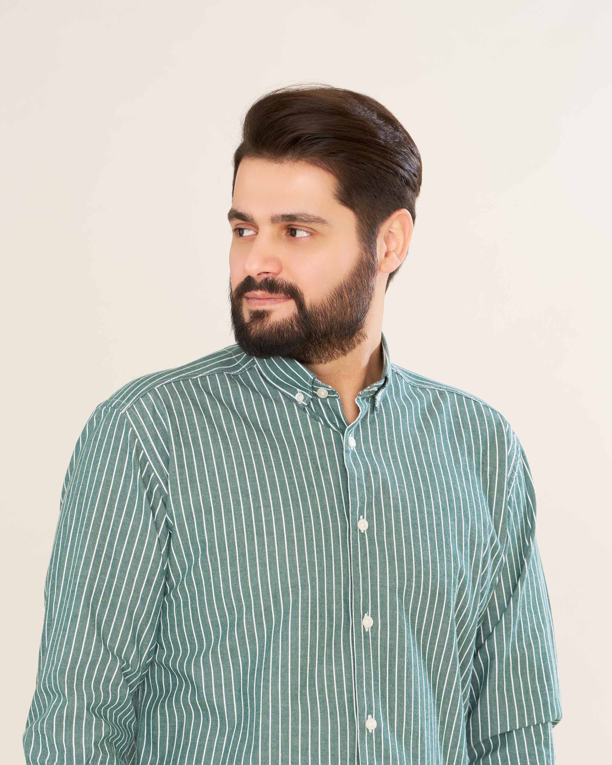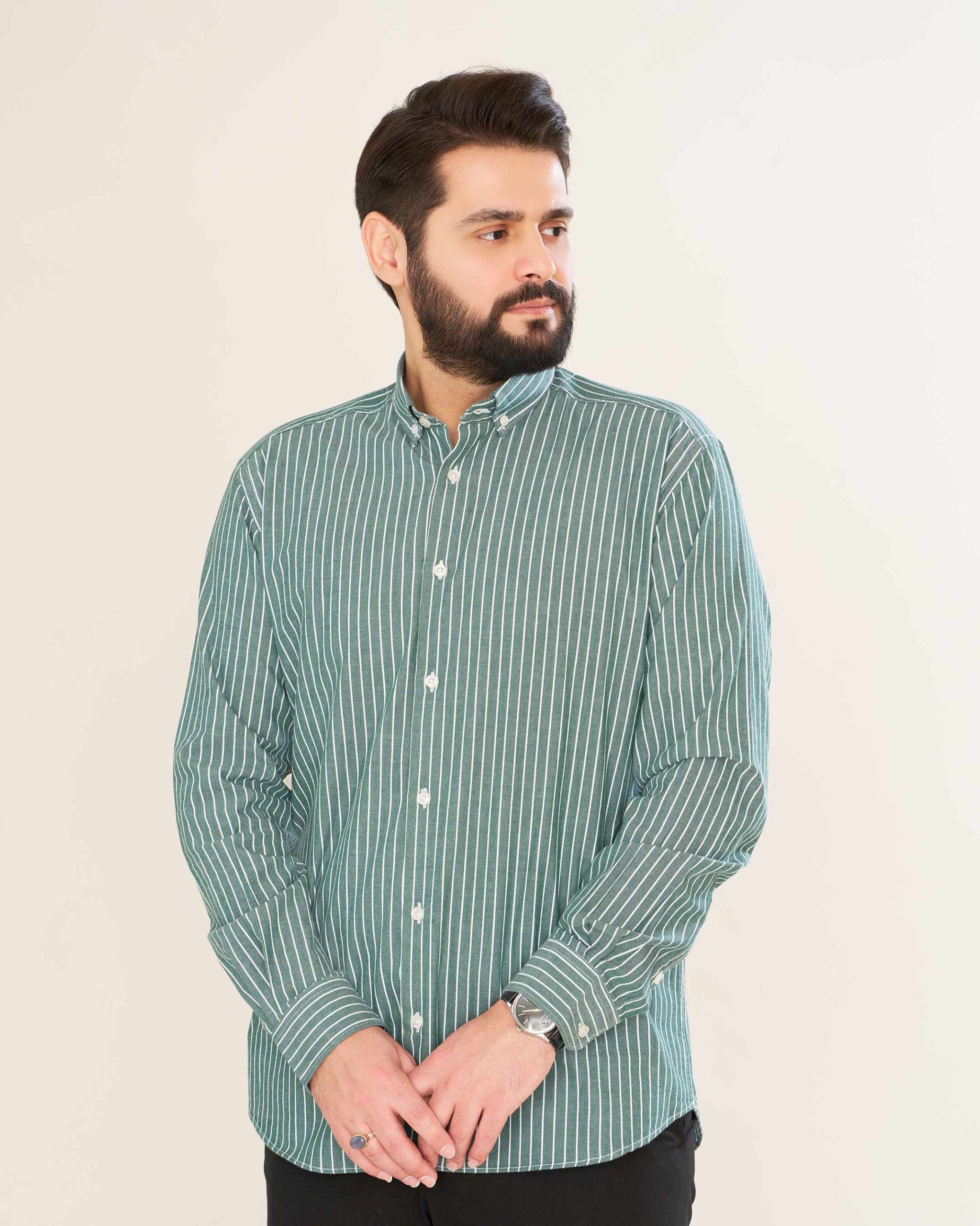 پیراهن یقه انگلیسی پارچه پنبه راه راه سفید و سبز کد PS21166