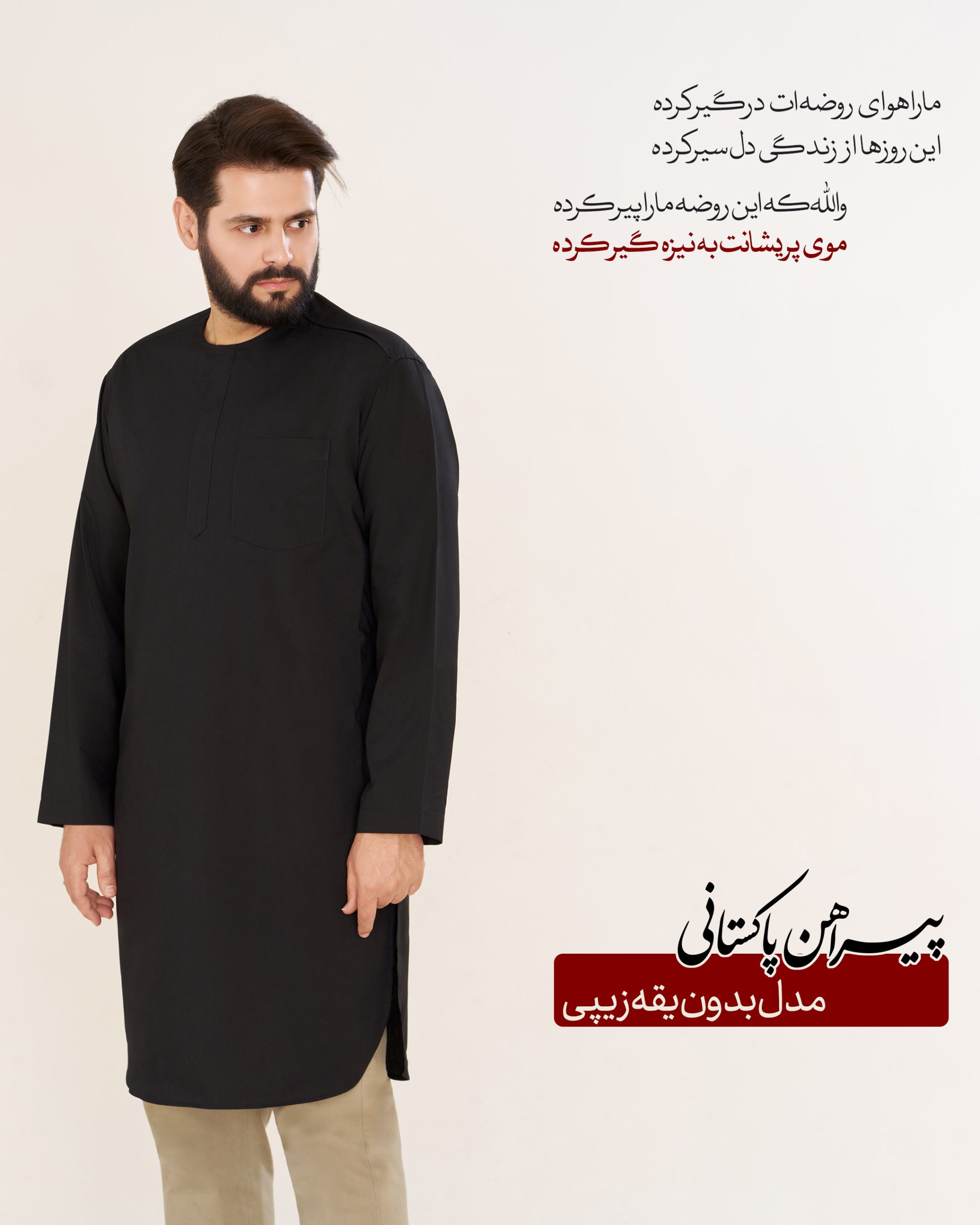 ما پیراهن پاکستانی را با دو مدل استایل متفاوت تولید نموده ایم. هم پیراهن پاکستانی یقه آخوندی در حال حاضر در مجموعه موجود می باشد و هم پیراهن پاکستانی بدون یقه زیپی.