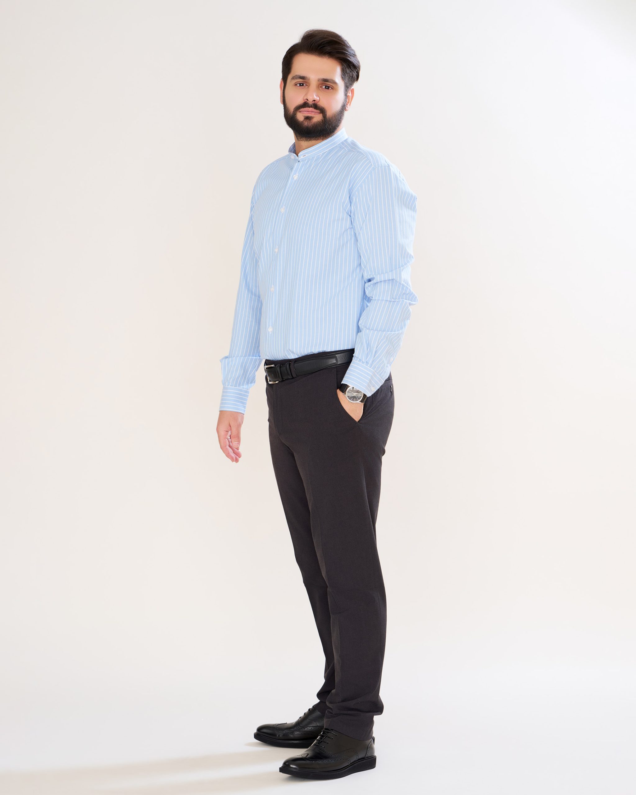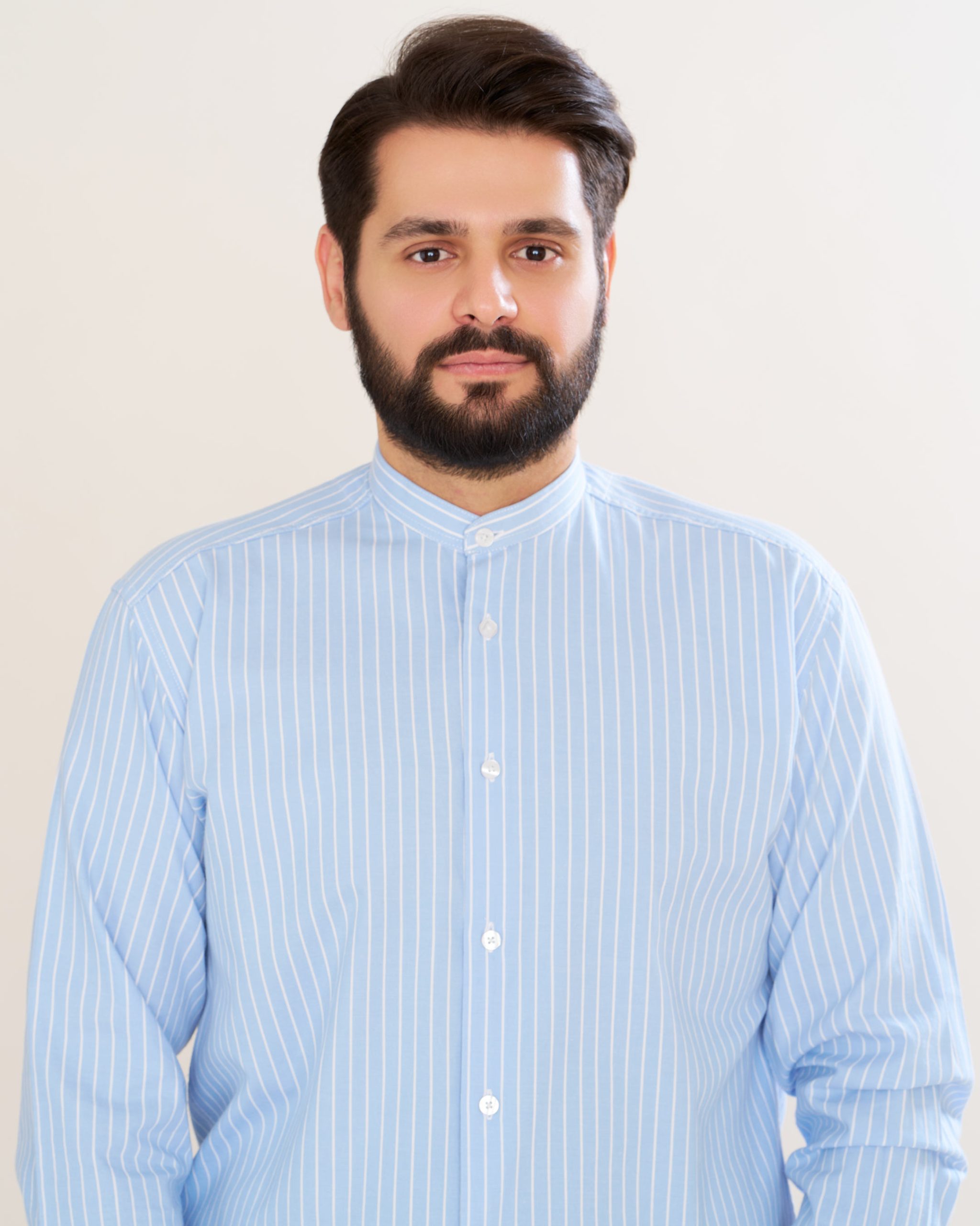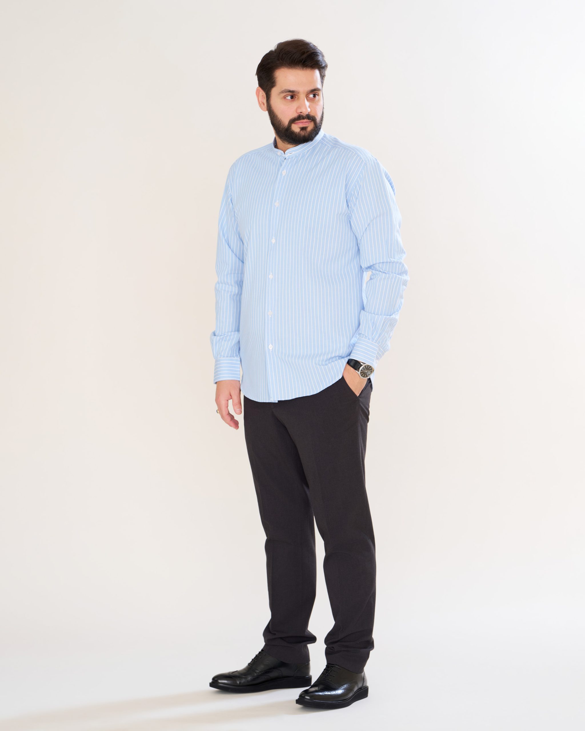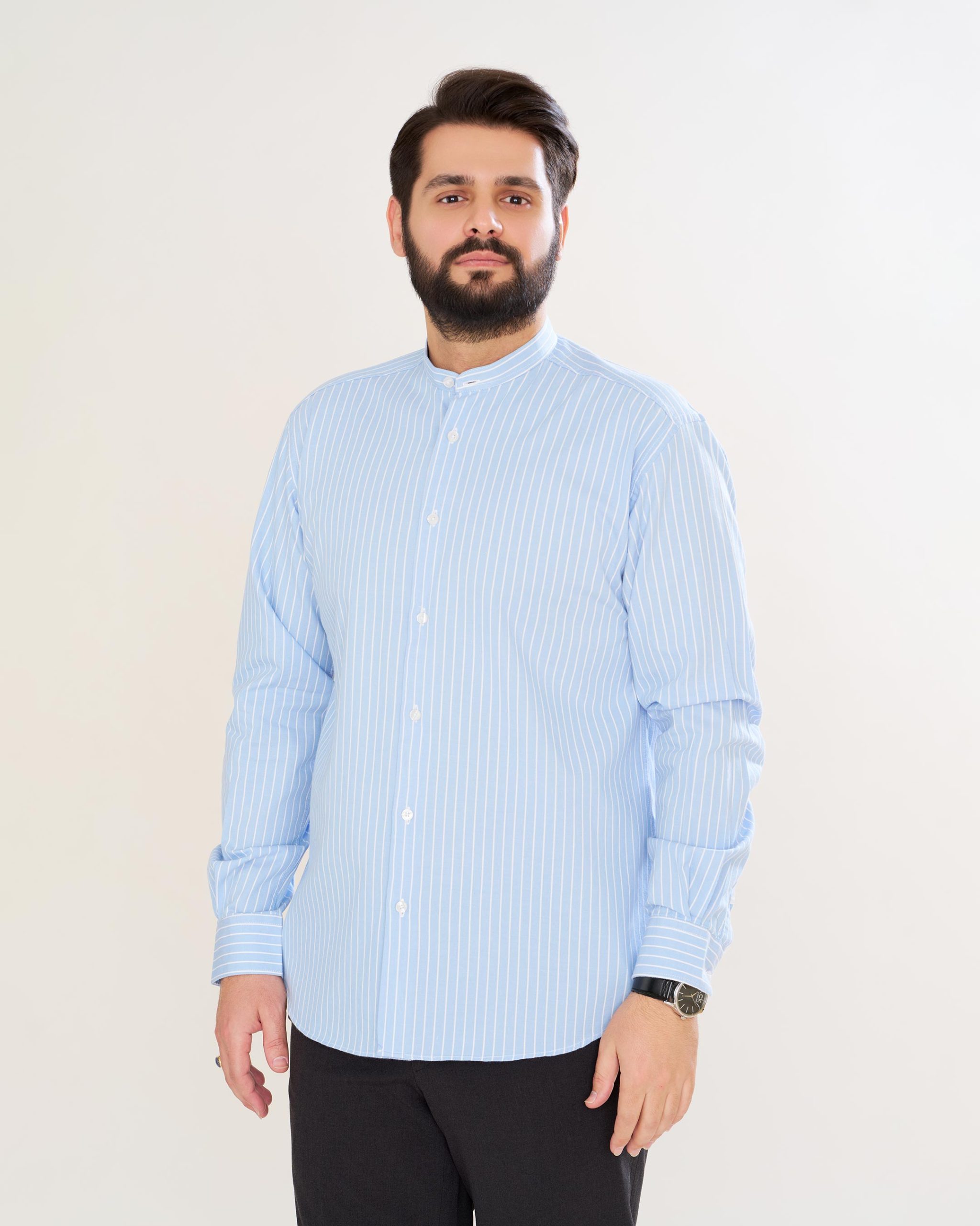 پیراهن اسپرت یقه فرنچ عصر عاشورا با رنگ آبی روشن و خطوط سفید،