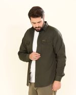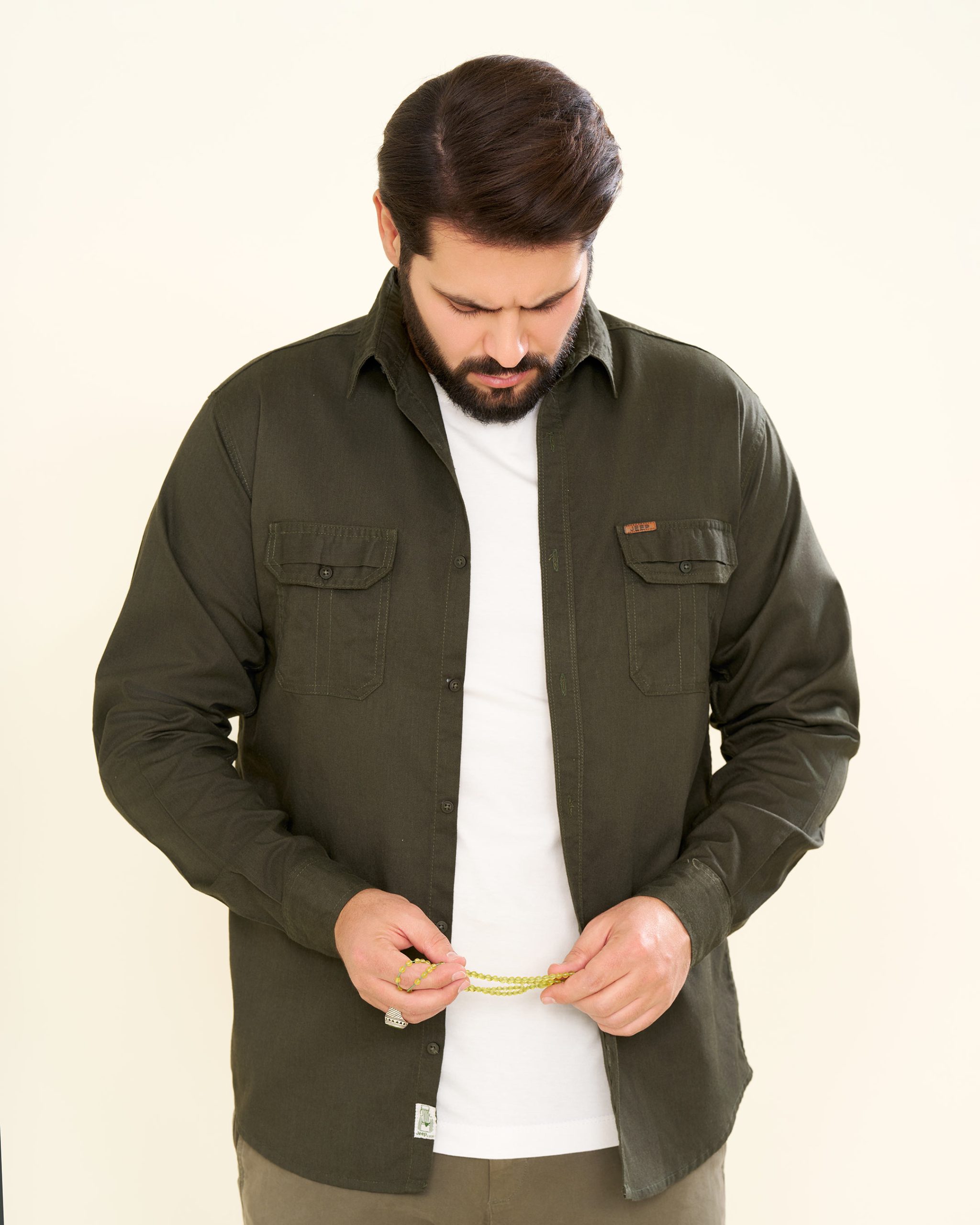 پیراهن کتان دوجیب طرح JEEP زمینه رنگ سبز تیره (PD12052)