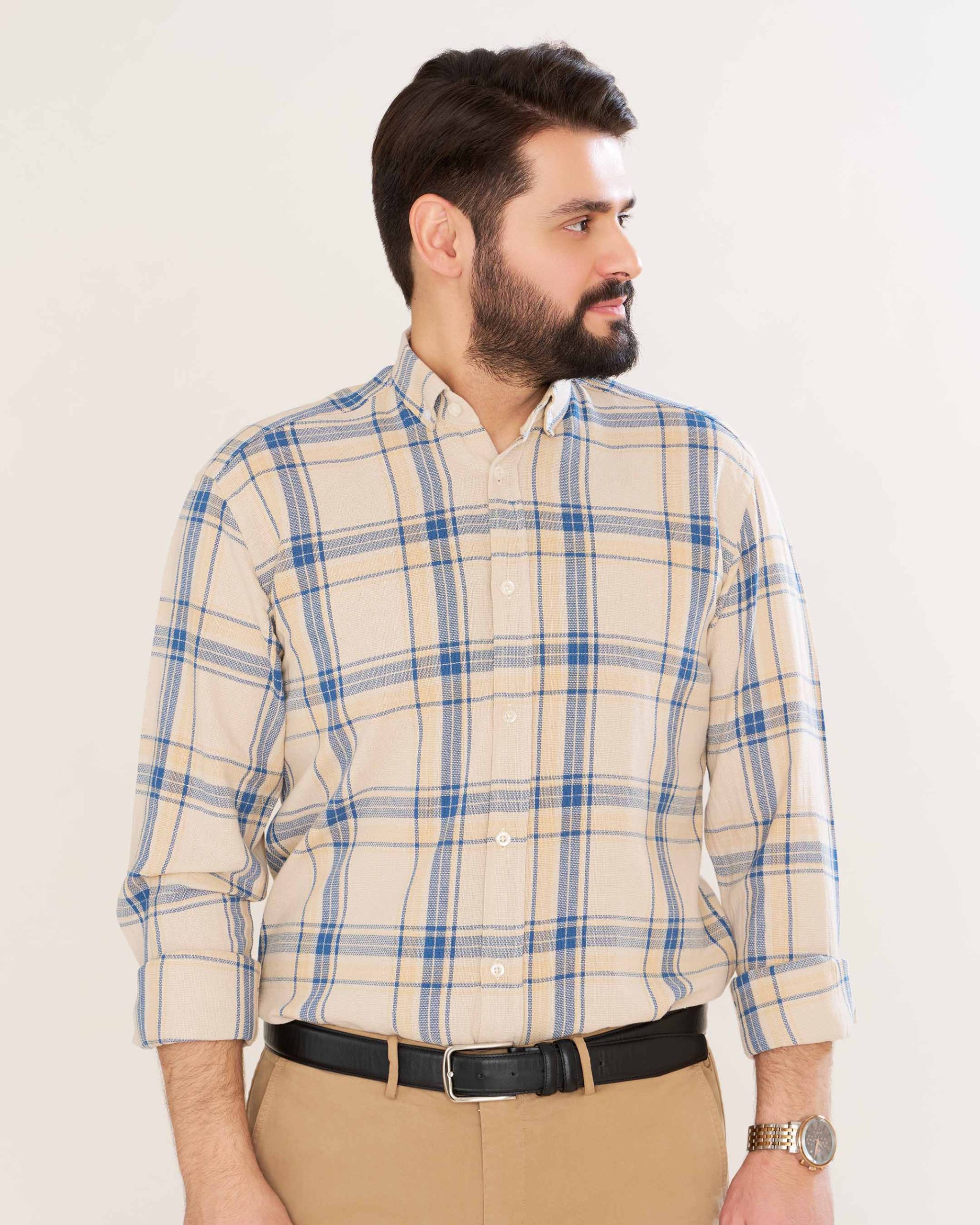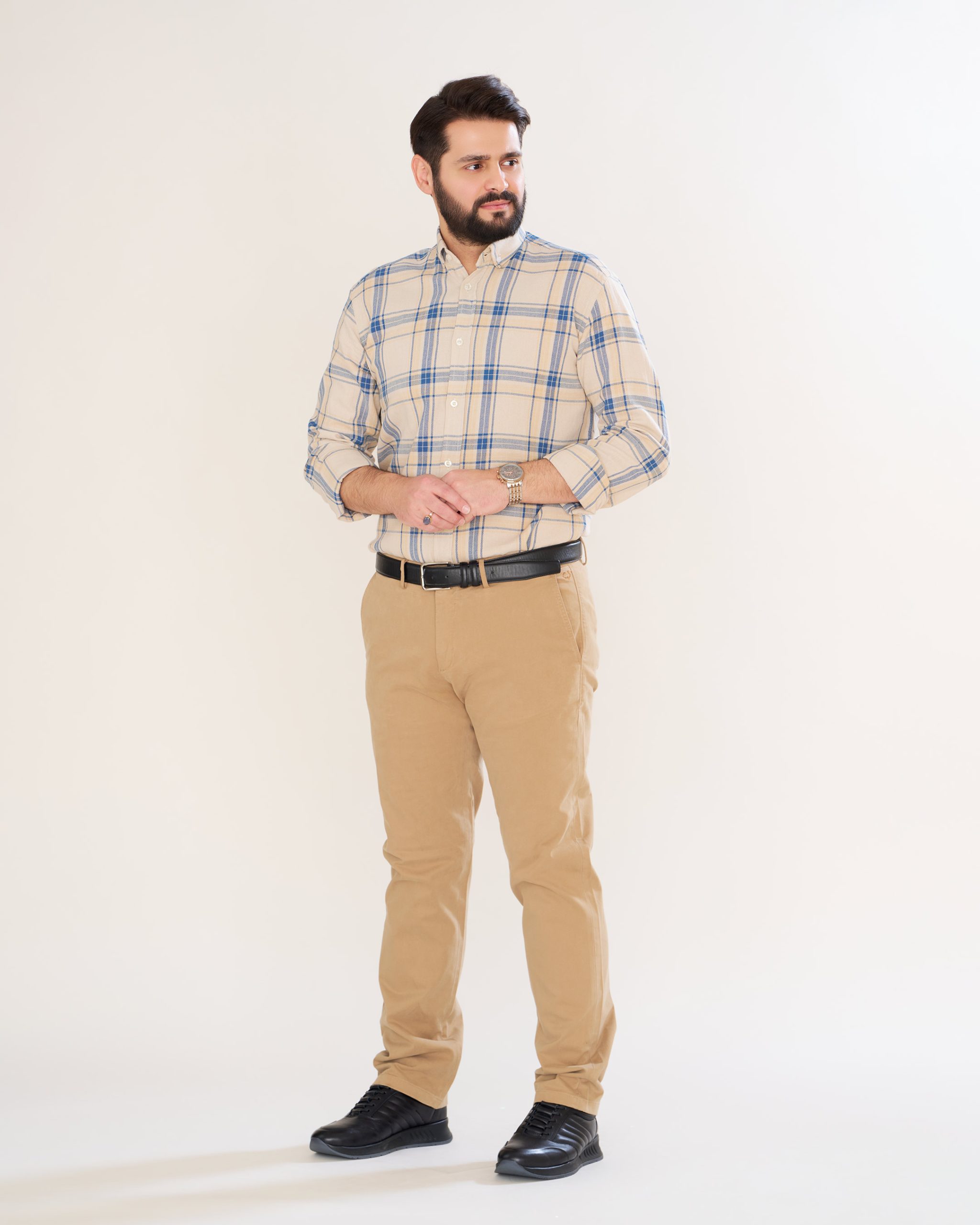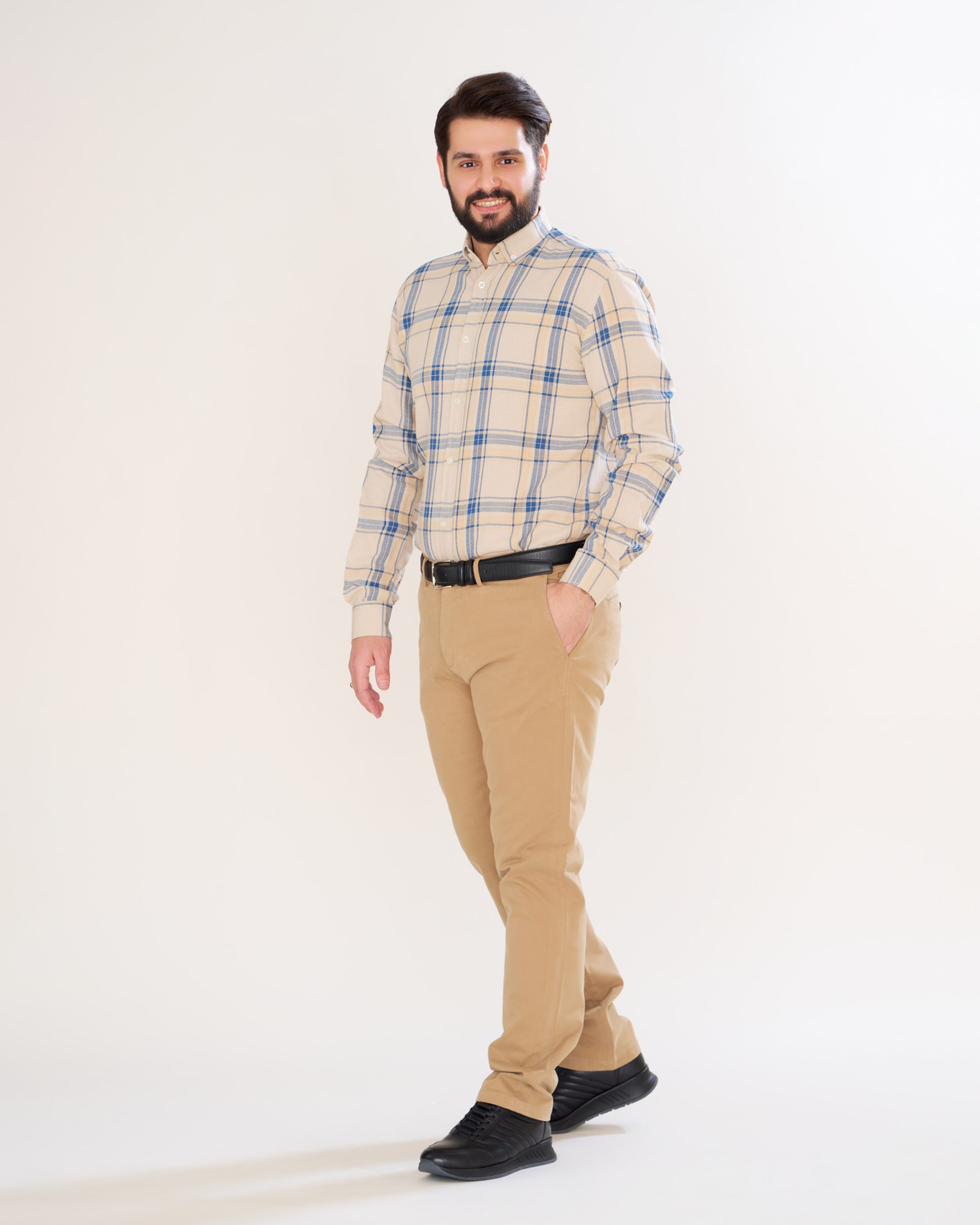 پیراهن یقه انگلیسی پارچه پنبه چهارخانه زمینه کرم کد PS21163