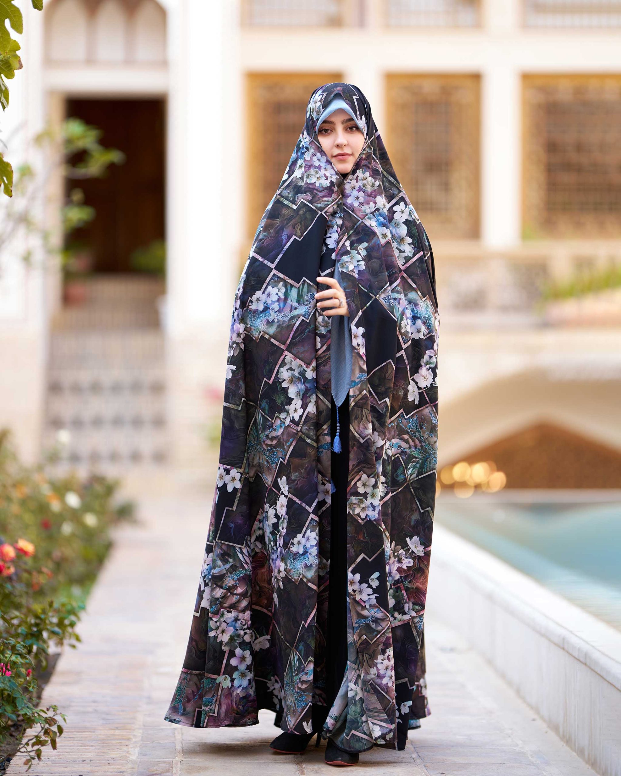 این چادر زیبا سه بعدی پارچه ای مات و درخشان دارد. این ویژگی متضاد گل های درخشان را از زمینه مات بیرون می کشد و باعث می شود گل ها سه بعدی به نظر آیند. گل های درخشان و زمینه مات درخشندگی و جلوه خاصی به چادر می دهد. در زمینه چادر رنگ ها به گونه ای مات شده اند که در دسته رنگ های خنثی قرار می گیرند و این زمینه با رنگ خنثی آن را بسیار شیک کرده و هرگز خسته کننده نمی شود. در رنگ گل ها از رنگ متضاد زمینه استفاده شده که همه، رنگ های شاد هستند.