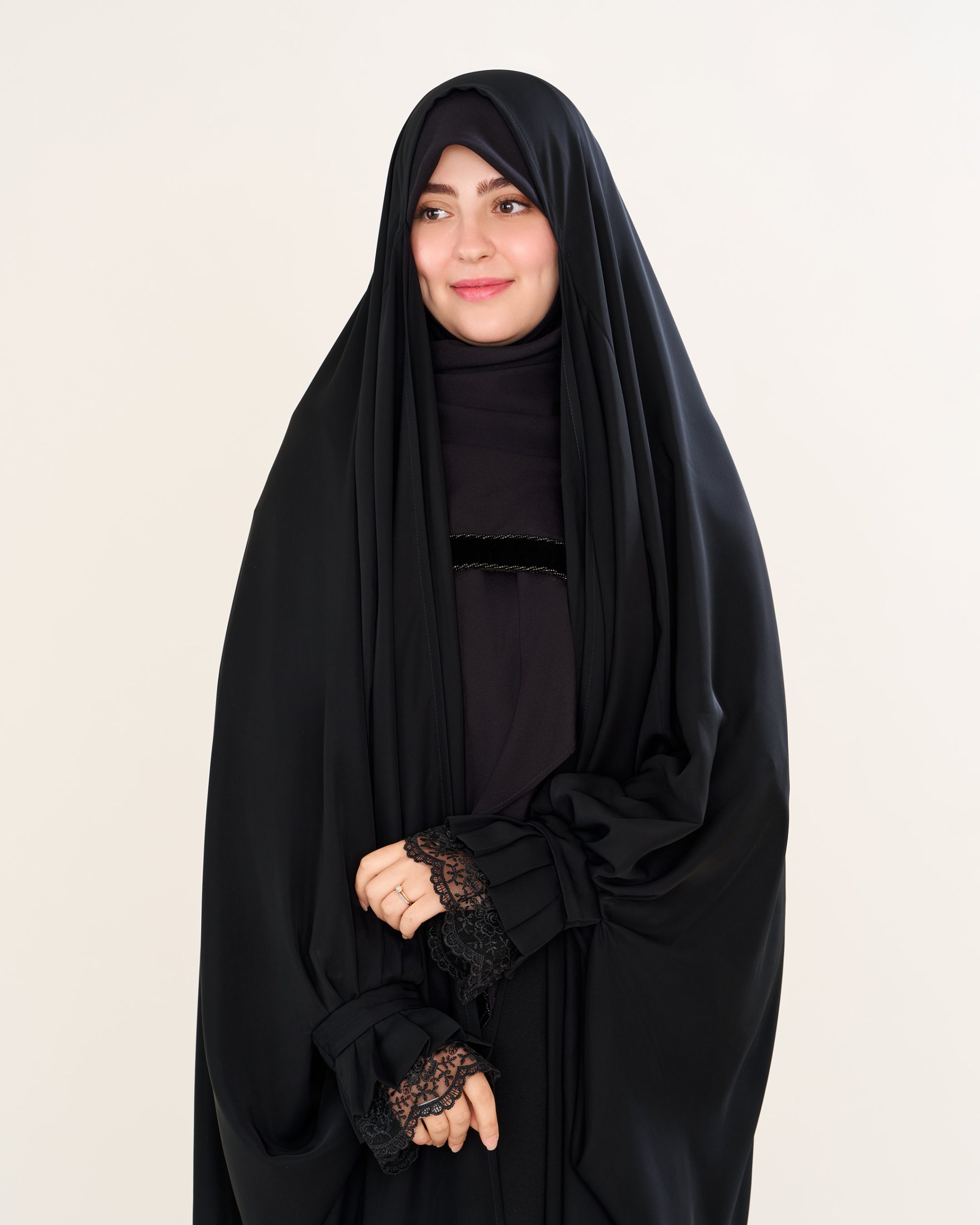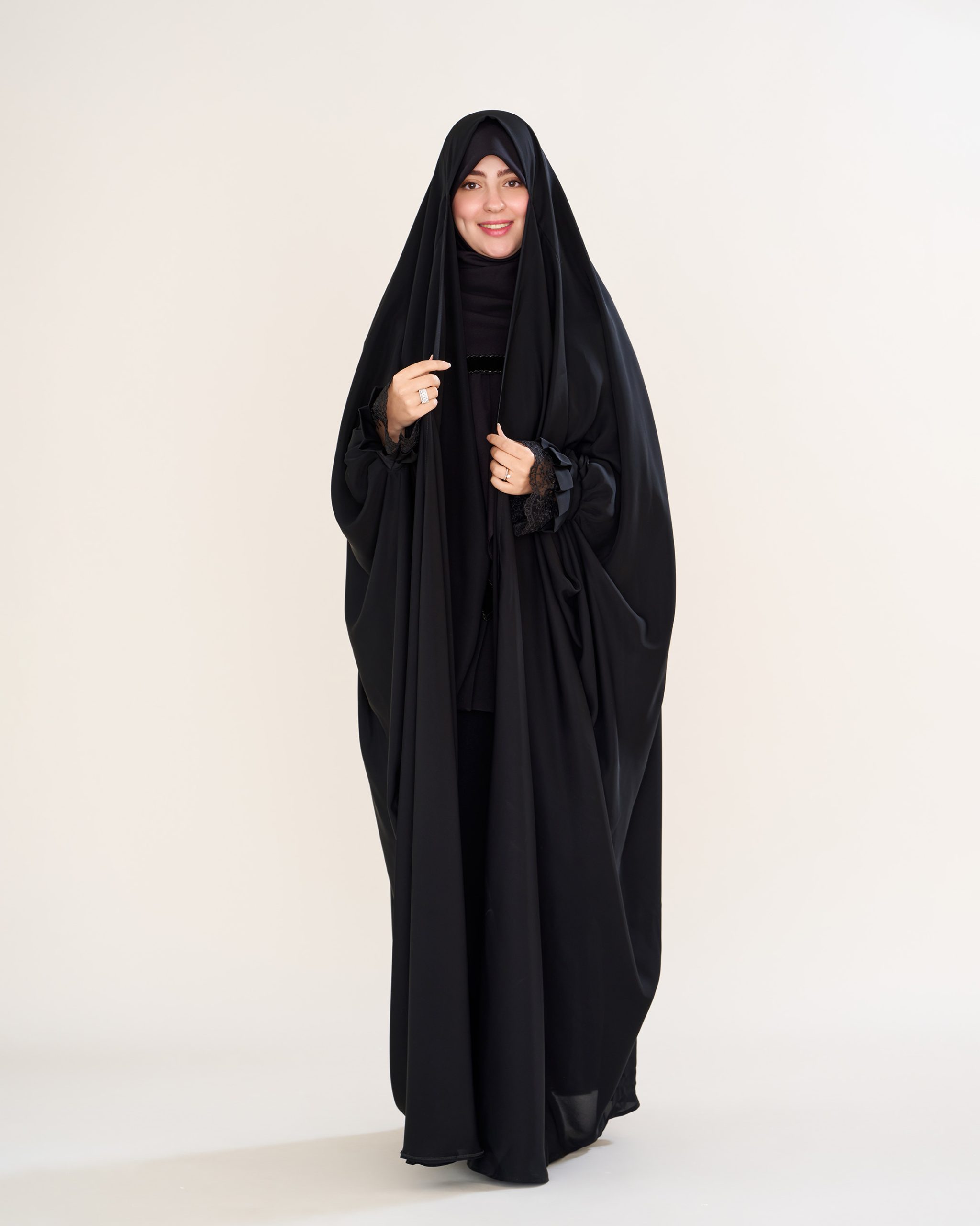 در چادر عربی کار شده مدل حنانه لبه آستین چادر با تور بسیار زیبایی تزیین گشته و جلوه خاصی به این محصول داده است. قرار گرفتن چین لبه آستین و تور تزیینی بسیار زیبا کنار یکدیگر یک اثر هنری زیبا و منسجم خلق شده است. این طراحی زیبا چادر عربی را به چادری مجلسی و فاخر و شیک تبدیل کرده است.این چادر را می توانید در مراسم رسمی و غیر رسمی و هر جایی که دوست دارید زیبایی حجابتان دو چندان شود به سر کنید. این چادر درعین مجلسی و زیبا بودن مروارید ندارد و نگین های آن ریز بوده و به جایی گیر نمی کند و گلدوزی آن با دوام و مناسب جاهای روزمره نیز هست.