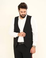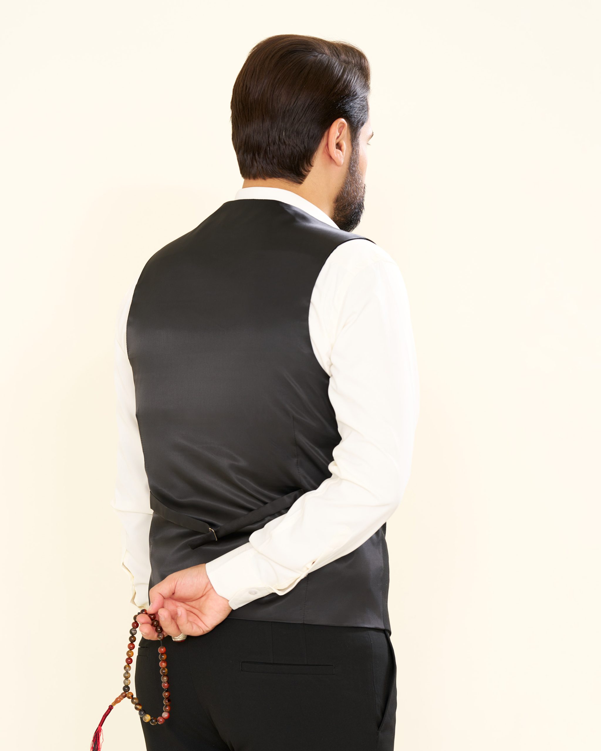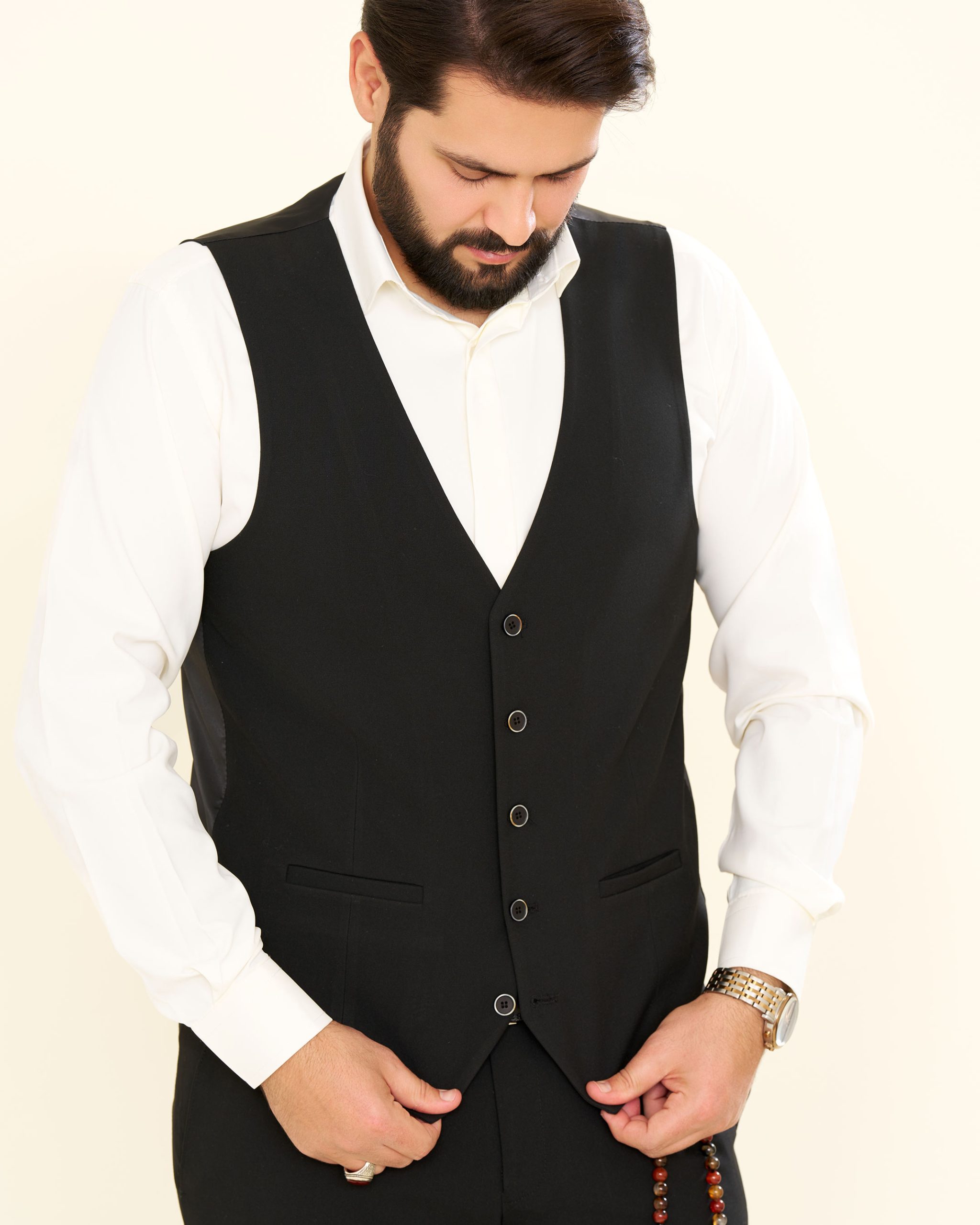 جلیقه، دارای پنج دکمه و آستر کامل است؛ خوشفرم، منظم و کاملاً متناسب با کت و شلوار.