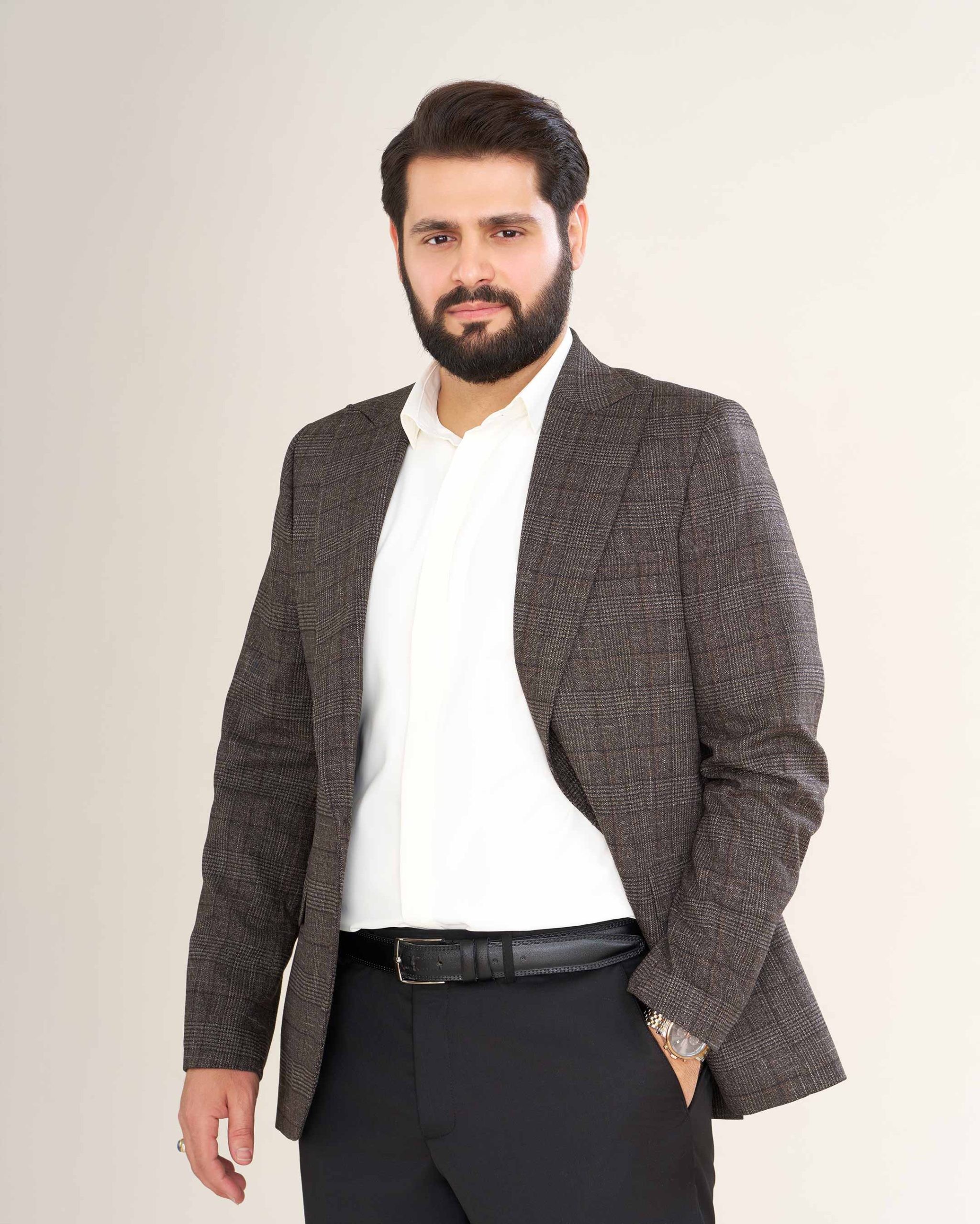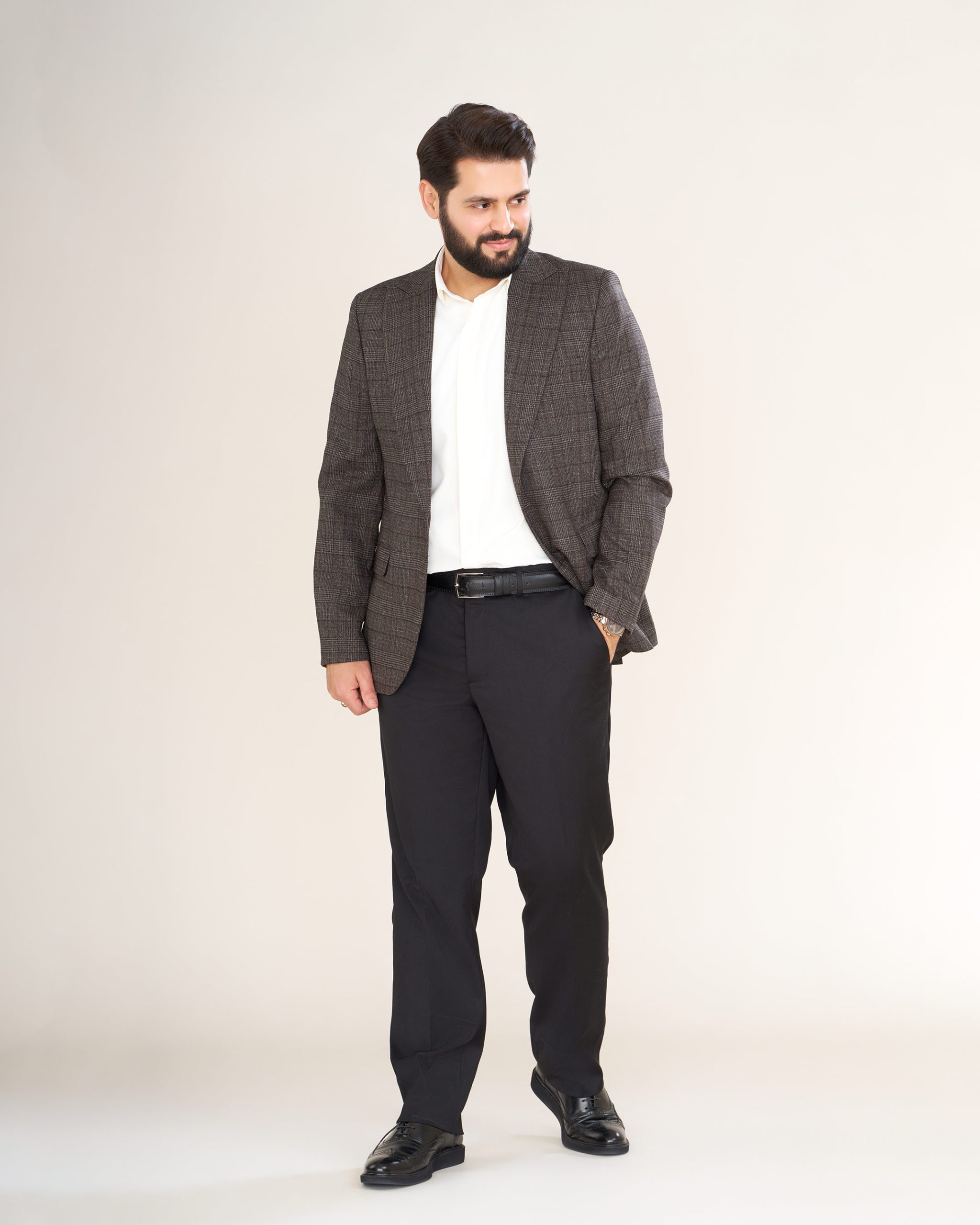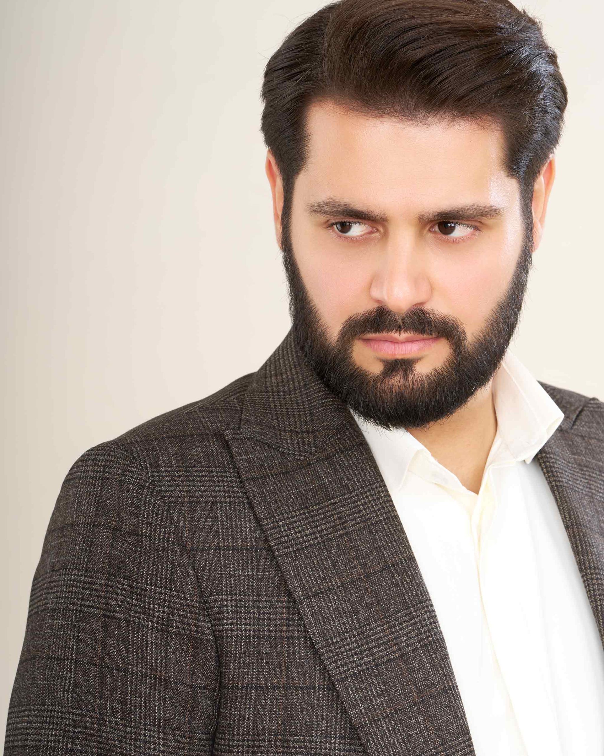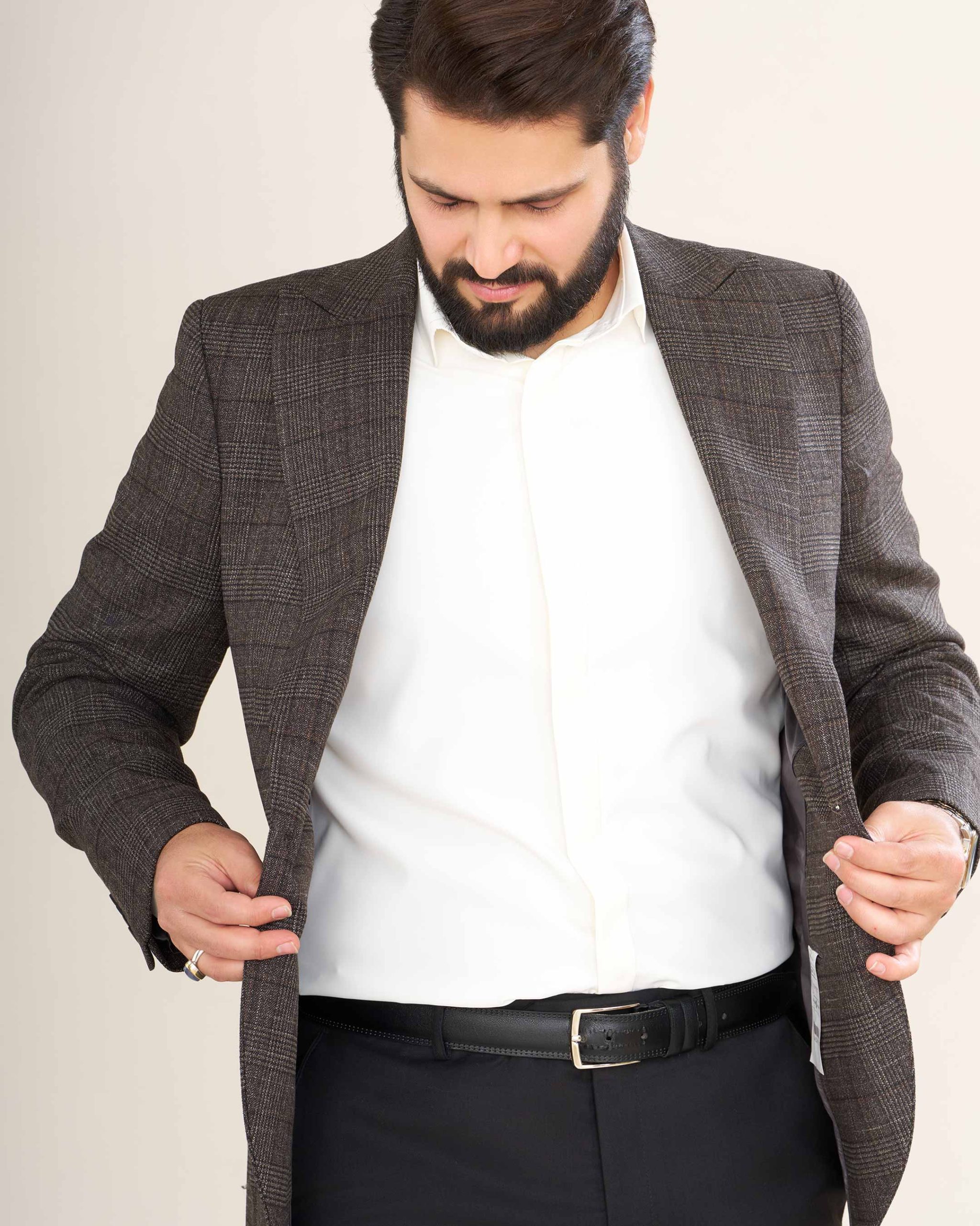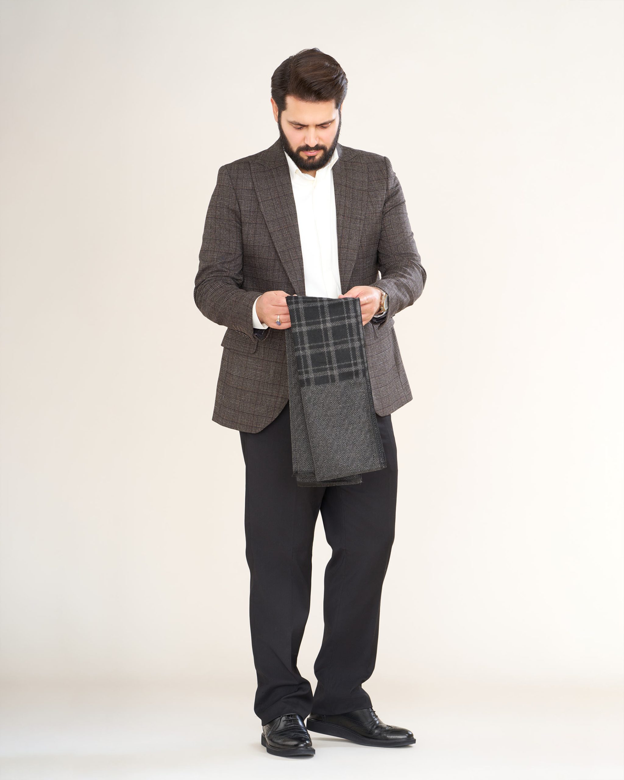 کت تک اسپرت از پارچه فاستونی درجهیک، با طرح چهارخونه زمینه قهوهای، انتخابی فوقالعاده برای استایلهای نیمهرسمی و روزمره.